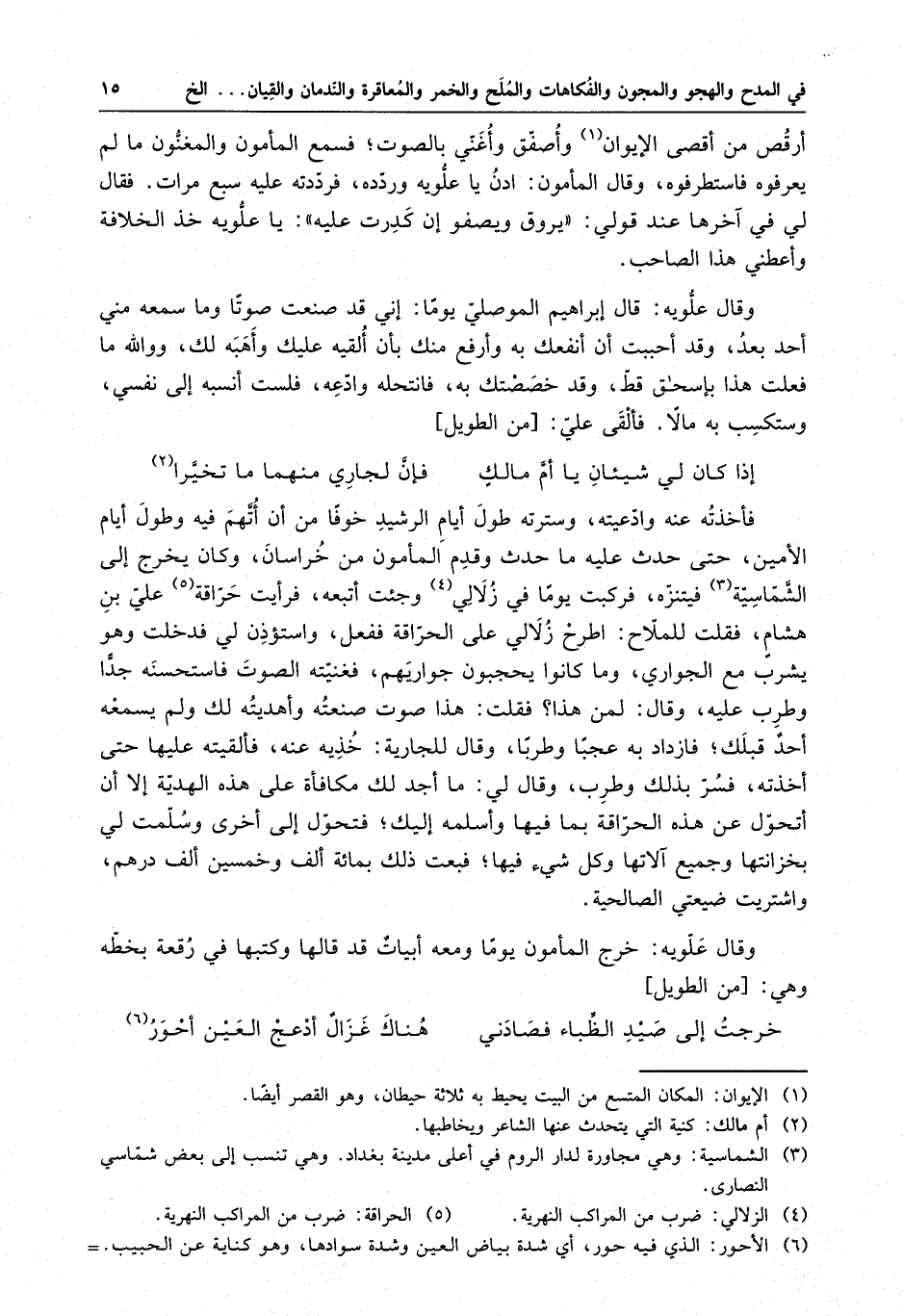 فأخذته عنه وادعيته ، وسترته طول أيام الرشيد خوفاً من أن أتهم فيه وطول أيام الأمين ، حتى حدث عليه ما حدث وقدم المأمون من خراسان ، وكان يخرج إلى الشماسية فيتنزه ، فركبت يوماً في زلالي وجئت أتبعه ، فرأيت حراقة على بن هشام ، فقلت للملاح : اطرح زلالي على الحراقة ففعل ، واستؤذن لي فدخلت وهو يشرب مع الجواري ، وما كانوا يحجبون جواريهم ، فغنيته الصوت فاستحسنه جداً وطرب عليه ، وقال : لمن هذا ؟ فقلت : هذا صوتٌ صنعته وأهديته لك ولم يسمعه أحدٌ قبلك ، فازداد به عجباً وطرباً ، وقال للجارية : خذيه عنه ، فألقيته عليها حتى أخذته ، فسر بذلك وطرب ، وقال لي : ما أجد لك مكافأةً على هذه الهدية إلا أن أتحول عن هذه الحراقة بما فيها وأسلمه إليك ، فتحول إلى أخرى وسلمت لي بخزانتها وجميع آلاتها وكل شيء فيها ، فبعت ذلك بمائة ألفٍ وخمسين ألف درهم ، واشتريت ضيعتي الصالحية .