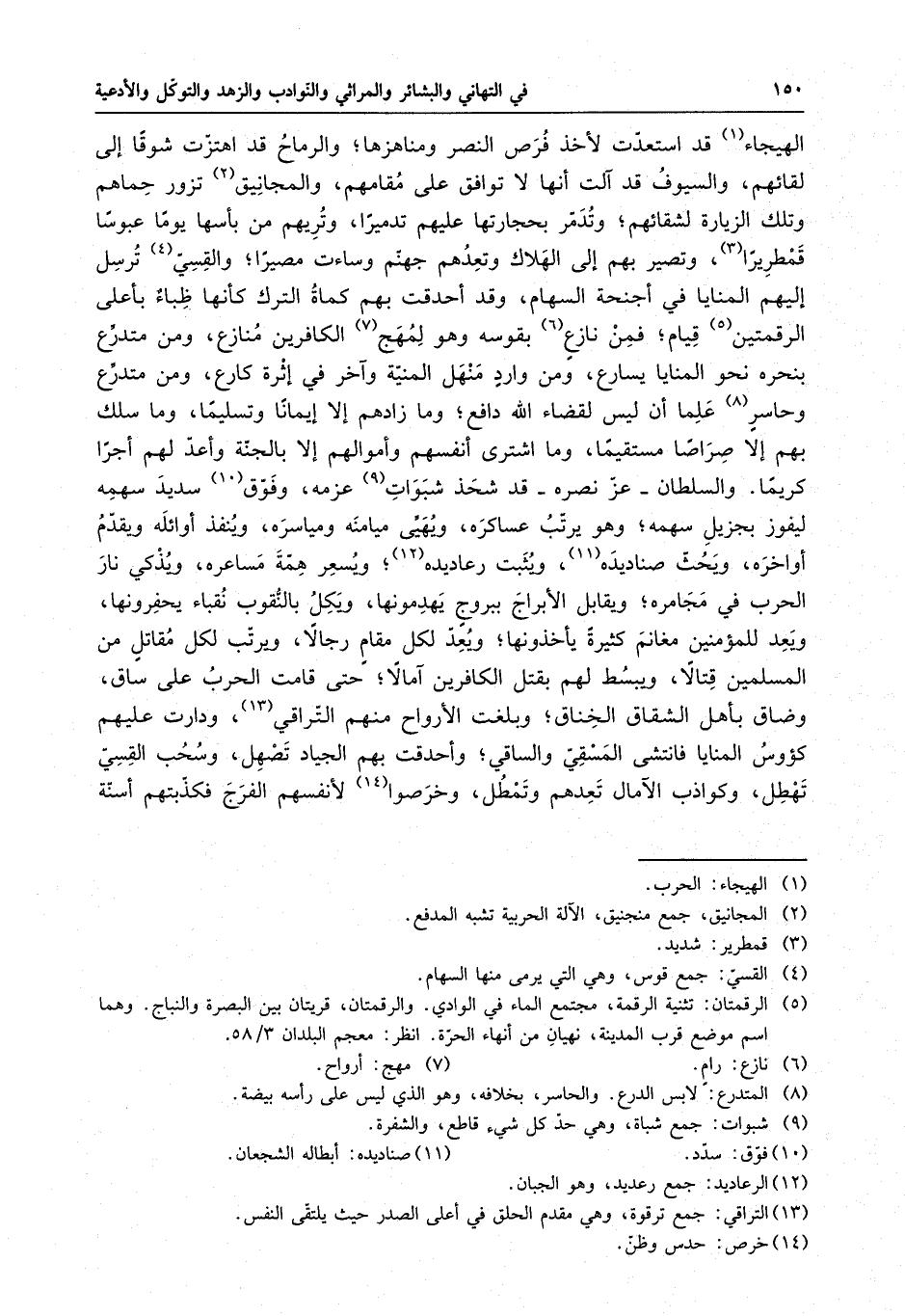الهيجاء قد استعدت لأخذ فرص النصر ومناهزها ، والرماح قد اهتزت شوقاً إلى لقائهم ، والسيوف قد آلت أنها لا توافق على مقامهم ، والمجانيق تزور حماهم وتلك الزيارة لشقائهم ، وتدمر بحجارتها عليهم تدميراً ، وتريهم من بأسها يوماً عبوساً قمطريراً ، وتصير بهم إلى الهلاك وتعدهم جهنم وساءت مصيراً ، والقسى ترسل إليهم المنايا في أجنحة السهام ، وقد أحدقت بهم كماة الترك كأنها ظباءٌ بأعلى الرقمتين قيام ، فمن نازعٍ بقوسه وهو لمهج الكافرين منازع ، ومن متدرعٍ بنحره نحو المنايا يسارع ، ومن وادٍ منهل المنية وآخر في إثره كارع ، ومن متدرعٍ وحاسرٍ علماً أن ليس لقضاء الله دافع ، وما زادهم إلا إيماناً وتسليماً ، وما سلك بهم إلا صراطاً مستقيماً ، وما اشترى أنفسهم وأموالهم إلا بالجنة وأعد لهم أجراً كريماً . والسلطان - عز نصره - قد شحذت شبوات عزمه ، وفوق سديد سهمه ليفوز بجزيل سهمه ، وهو يرتب عساكره ، ويهيئ ميامنه ومياسره ، وينفذ أوائله ويقدم أواخره ، ويحث صناديه ، ويثبت رعاديده ، ويسعر همة مساعره ، ويذكي نار الحرب في مجامره ، ويقابل الأبراج ببروجٍ يهدمونها ، ويكل بالنقوب نقباء يحفرونها ، ويعد للمؤمنين مغانم كثيرةً يأخذونها ، ويعد لكل مقامٍ رجلاً ، ويرتب لكل مقاتلٍ من المسلمين قتلاً ، ويبسط لهم بقتل الكافرين آمالا ، حتى قامت الحرب على ساقٍ ، وضاق بأهل الشقاق الخناق ، وبلغت الأرواح منهم التراقي ، ودارت عليهم كؤوس المنايا فانتشى المسقي والساقي ، وأحدقت بهم الجياد تصهل ، وسحب القسى تهطل ، وكواذب الآمال تعدهم وتمطل ، وخرصوا لأنفسهم الفرج فكذبتهم أسنة