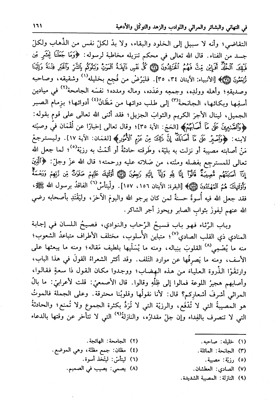 التقاضي ، وأنه لا سبيل إلى الخلود والبقاء ، ولا بد لكل نفسٍ من الذهاب ولكل جسدٍ من الفناء . قال الله تعالى في محكم تنزيله مخاطبةً لرسوله : " وما جعلنا لبشرٍ من قبلك الخلد أفائن مت فهم الخالدون كل نفسٍ ذائقةٌ الموت ونبلوكم بالشر والخير فتنةً وإلينا ترجعون " . فليرض من فجع بخليله وشقيقه ، وصاحبه وصديقه ، وأهله وولده ، وجمعه وعدده ، وماله ومدده ، نفسه الجامحة في ميادين أسفها وبكائها ، الجانحة إلى طلب دوائها من مظان أدوائها ، بزمام الصبر الجميل ، لينال الأجر الكريم والثواب الجزيل ، فقد أثنى الله تعالى على قومٍ بقوله : " والصابرين على ما أصابهم " ، وقال تعالى إخباراً عن لقمان في وصيته لابنه : " واصبر على ما أصابك إن ذلك من عزم الأمور " . وليسترجع من أصابته مصيبةٌ أو نزلت به بلية ، وطرقته حادثةٌ أو لمت به رزية ، لما جعل الله تعالى للمسترجع بفضله ومنته ، من صلاته عليه ورحمته ، قال الله عز وجل : " الذين إذا أصابتهم مصيبةٌ قالوا إنا لله وإنا إليه راجعون أولئك عليهم صلواتٌ من ربهم ورحمةٌ وأولئك هم المهتدون " . وليتأس الفاقد برسول الله ( صلى الله عليه وسلم ) ، فقد جعل الله فيه أسوةً حسنةً لمن كان يرجوا الله واليوم الآخر ، وليقتد بأصحابه رضي الله عنهم ليفوز بثواب الصابر ويحوز أجر الشاكر .