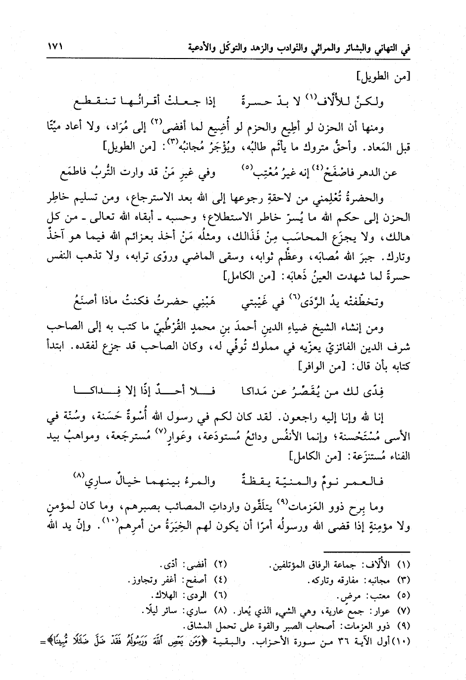والحضرة تعلمني من لاحقة رجوعها إلى الله بعد الاسترجاع ، ومن تسليم خاطر الحزن إلى حكم الله ما يسر خاطر الاستطلاع ، وحسبه - أبقاه الله تعالى - من كل هالك ، ولا يجزه المحاسب من فذلك ، ومثله من أخذ بعزائم الله فيما هو آخذٌ وتارك . جبر الله مصابه ، وعظم ثوابه ، وسقى الماضي وروى ترابه ، ولا تذهب النفس حسرةً لما شهدت العين ذهابه .