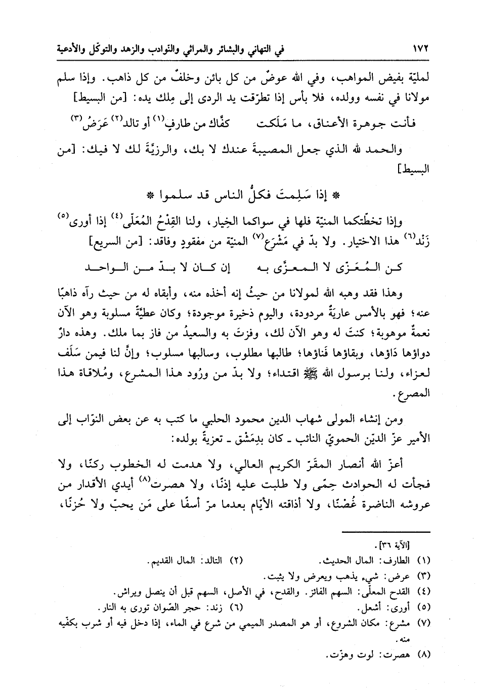 لمليةٌ بفيض المواهب ، وفي الله عوضٌ من كل بائنٍ وخلفٌ من كل ذاهب . وإذا سلم مولانا في نفسه وولده ، فلا بأس إذا تطرقت يد الردى إلى ملك يده .