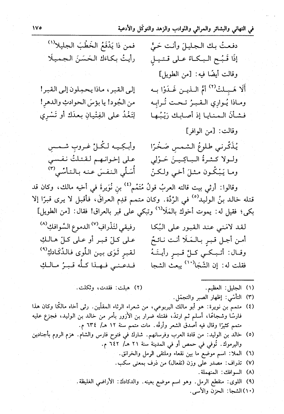وقالوا : أرثى بيتٍ قالته العرب قول متمم بن نورية في أخيه مالك ، وكان قد قتله خالد بن الوليد في الردة . وكان متمم قدم العراق ، فاقبل لا يرى قبراً إلا بكى ، فقيل له : يموت أخوك بالملا وتبكي على قبرٍ بالعراق فقال :