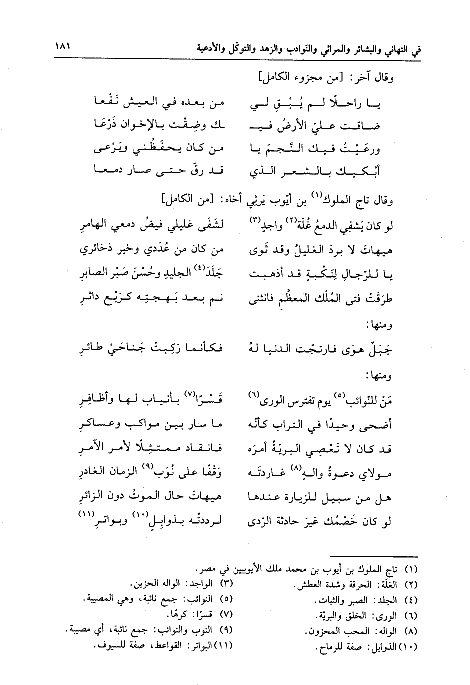 يا للرجال لنكبةٍ قد أذهبت . . . جلد الجليد وحسن صبر الصابر طرقت فتى الملك المعظم فانثنى . . . من بعد بهجته كربع طائر