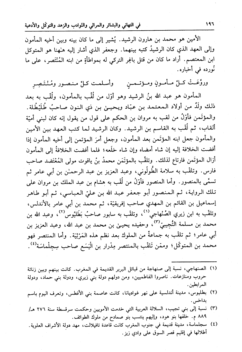 وروعت كل مأمونٍ ومؤتمنٍ . . . وأسلمت كل منصورٍ ومنتصر المأمون هو عبد الله بن الرشيد وهو أول من لقب بالمأمون ، ولقب به بعد ذلك ولدٌ من أولاد المعتمد بن عباد ويحيى بن ذي النون صاحب طليطلة . والمؤتمن فأول من لقب به مروان بن الحكم على قول من يقول إنه كان لبني أمية ألقاب ، ثم لقب به القاسم بن الرشيد . وكان الرشيد لما كتب العهد بين الأمين والمأمون جعل ابنه المؤتمن بعد المأمون ، وجعل أمر المؤتمن إلى أخيه المأمون إذا أفضت الخلافة إليه إن شاء أمضاه وإن شاء خلعه ، فلما أفضت الخلافة إلى المأمون أزال المؤتمن فارتاع لذلك . وتلقب بالمؤتمن محمد بن ياقوت مولى المعتضد صاحب فارس . وتلقب به سلامة الطولوني ، وعبد العزيز بن عبد الرحمن بن أبي عامر ثم تسمى بالمنصور . وأما المنصور فأول من لقب به هشام بن عبد الملك بن مروان على تلك الرواية ، ثم المنصور أبو جعفر عبد الله بن علي العباسي ، ثم أبو طاهرٍ إسماعيل ابن القائم بن المهدي صاحب إفريقية ، ثم محمد بن أبي عامر بالأندلس ، وتلقب به ابن زيرى الصنهاجى ، وتلقب به سابور صاحب بطليوس ، وعبد الله بن محمد ابن مسلمة التجيبي ، وحفيده يحيى بن محمد بن عبد الله ، وعبد العزيز بن أبي عامر ، ثم تلقب به جماعةٌ من الملوك بعد نظم هذه المرثية . وأما المنتصر فهو محمد ابن المتوكل ، وممن تلقب بالمنتصر مدرار بن اليسع صاحب سجلماسة .