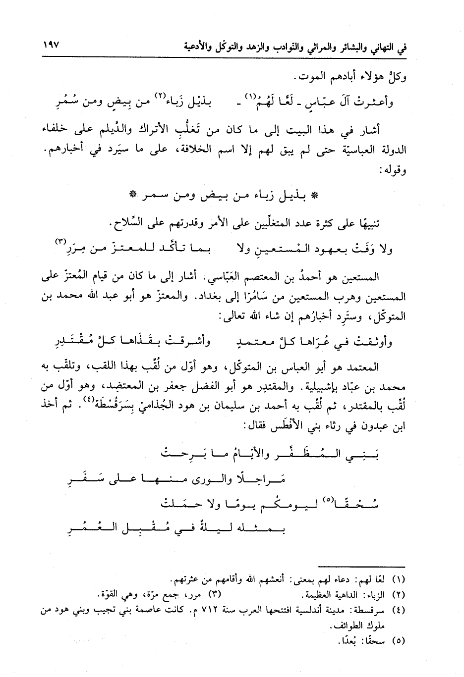 وأوثقت في عراها كل معتمدٍوأرقت بقذاها كل مقتدرالمعتمد هو أبو العباس بن المتوكل ، وهو أول من لقب بهذا اللقب ، وتلقب به محمد بن عباد بإشبيلية . والمقتدر هو أبو الفضل جعفر بن المعتضد ، وهو أول من لقب بالمقتدر ، ثم لقب به أحمد بن سليمان بن هود الجذامي بسرقسطة . ثم أخذ ابن عبدونٍ في رثاء بني الأفطس ، فقال :
