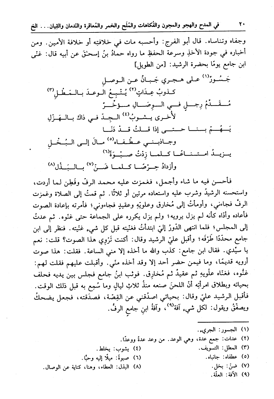 فأحسن فيه ما شاء وأجمل ، فغمزت عليه محمد الرف وفطن لما أردت ، واستحسنه الرشيد وشرب عليه واستعاده مرتين أو ثلاثاً . ثم قمت إلى الصلاة وغمزت الرف فجاءني ، وأومأت إلى مخارق وعلويه وعقيد فجاءوني ، فأمرته بإعادة الصوت فأعاده وأداه كأنه لم يزل يرويه ، ولم يزل يكرره على الجماعة حتى غنوه . ثم عدت إلى المجلس ، فلما انتهى الدور إلي ابتدأت فغنيته قبل كلٍ شيءٍ غنيته . فنظر إلى ابن الجامع محدداً طرفه ، وأقبل علي الرشيد وقال : أكنت تروي هذا الصوت ؟ قلت : نعم يا سيدي . فقال ابن الجامع : كذب والله ما أخذه إلا مني الساعة . فقلت : هذا صوتٌ أرويه قديماً ، وما فيمن حضر أحدٌ إلا وقد أخذه مني . وأقبلت عليهم فقلت لهم : غنوه ، فغناه علويه ثم عقيد ثم مخارق . فوثب ابن جامع فجلس بين يديه فحلف بحياته وبطلاق امرأته أن اللحن صنعه منذ ثلاث ليالٍ وما سمع به قبل ذلك الوقت . فأقبل الرشيد علي وقال : بحياتي اصدقني عن القصة ، فصدقته ، فجعل يضحك ويصفق ويقول : لكل شيء آفةٌ ، وآفة ابن جامع الرف .