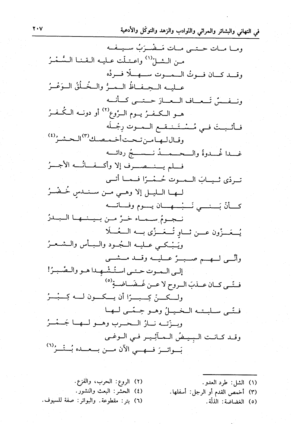 كأن بني نبهان يوم وفاته . . . نجوم سماءٍ خر من بينها البدر يعزون عن ثاوٍ تعزى به العلا . . . ويبكي عليه الجود والبأس والشعر