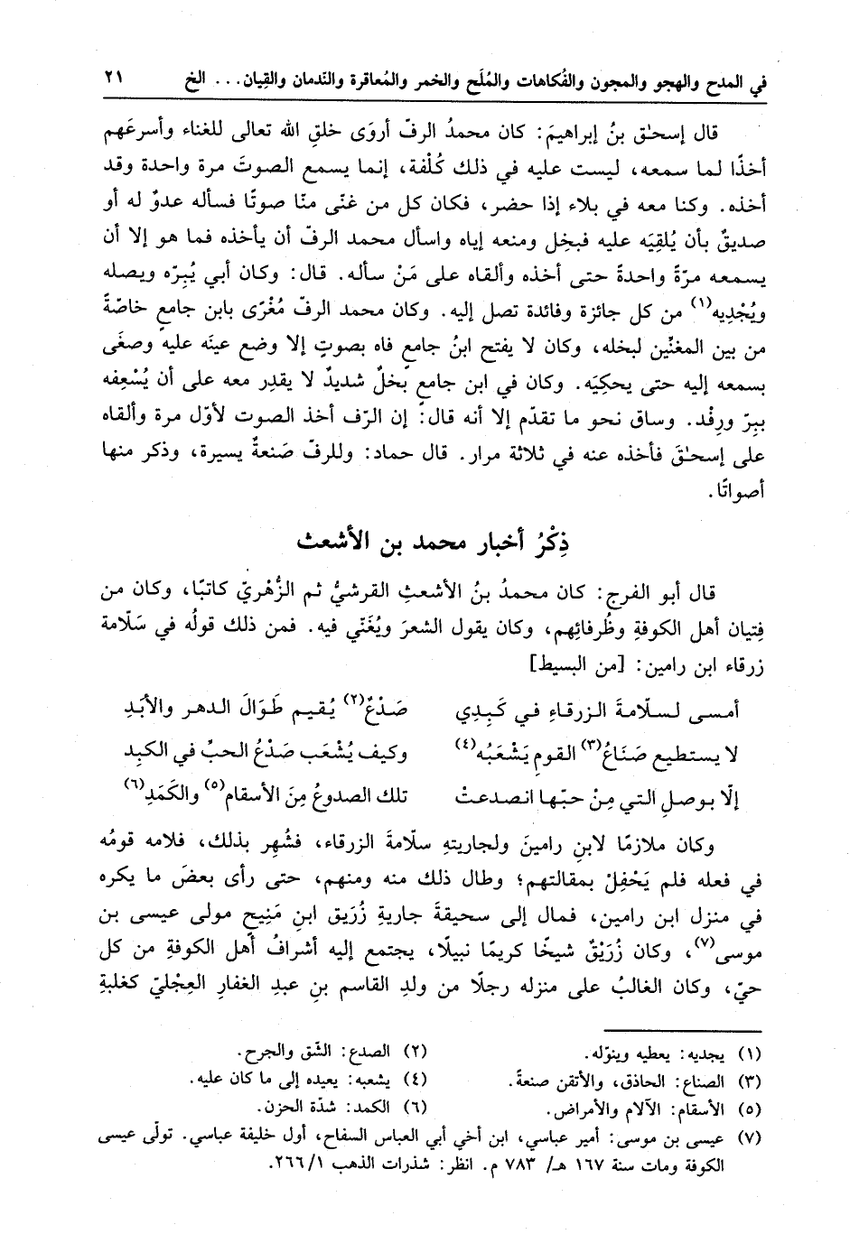 قال إسحاق بن إبراهيم : كان محمد الرف أروى خلق الله تعالى للغناء وأسرعهم أخذاً لما سمعه ، ليست عليه في ذلك كلفة ، إنما يسمع الصوت مرةً واحدةً وقد أخذه . وكنا معه في بلاء إذا حضر ، فكان كل من غنى منا صوتاً فسأله عدوٌ له أو صديق بأن يلقيه عليه فبخل ومنعه إياه وسأل محمد الرف أن يأخذه فما هو إلا أن يسمعه مرةً واحدةً حتى أخذه وألقاه على من سأله . قال : وكان أبي يبره ويصله ويجديه من كل جائزةٍ وفائدةٍ تصل إليه . وكان محمد الرف مغرًى بابن جامع خاصةً من بين المغنين لبخله ، وكان لا يفتح ابن جامع فاه بصوت إلا وضع عينيه عليه أصغى بسمعه عليه حتى يحكيه . وكان في ابن جامع بخلٌ شديدٌ لا يقدر معه على أن يسعفه ببرٍ ورفد . وساق نحو ما تقدم إلا أنه قال : إن الرف أخذ الصوت لأول مرةٍ وألقاه على إسحاق فأخذه عنه في ثلاث مرار ؟ قال حماد : وللرف صنعة يسيرة ، وذكر منها أصواتاً .