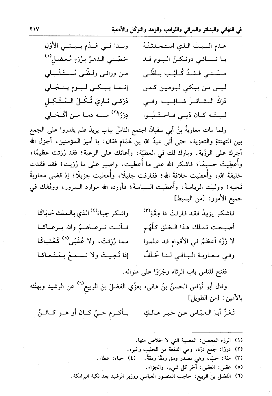 وقال أبو نواسٍ الحسن بن هانئ يعزي الفضل بن ربيعٍ عن الرشيد ويهنئه بالأمين :