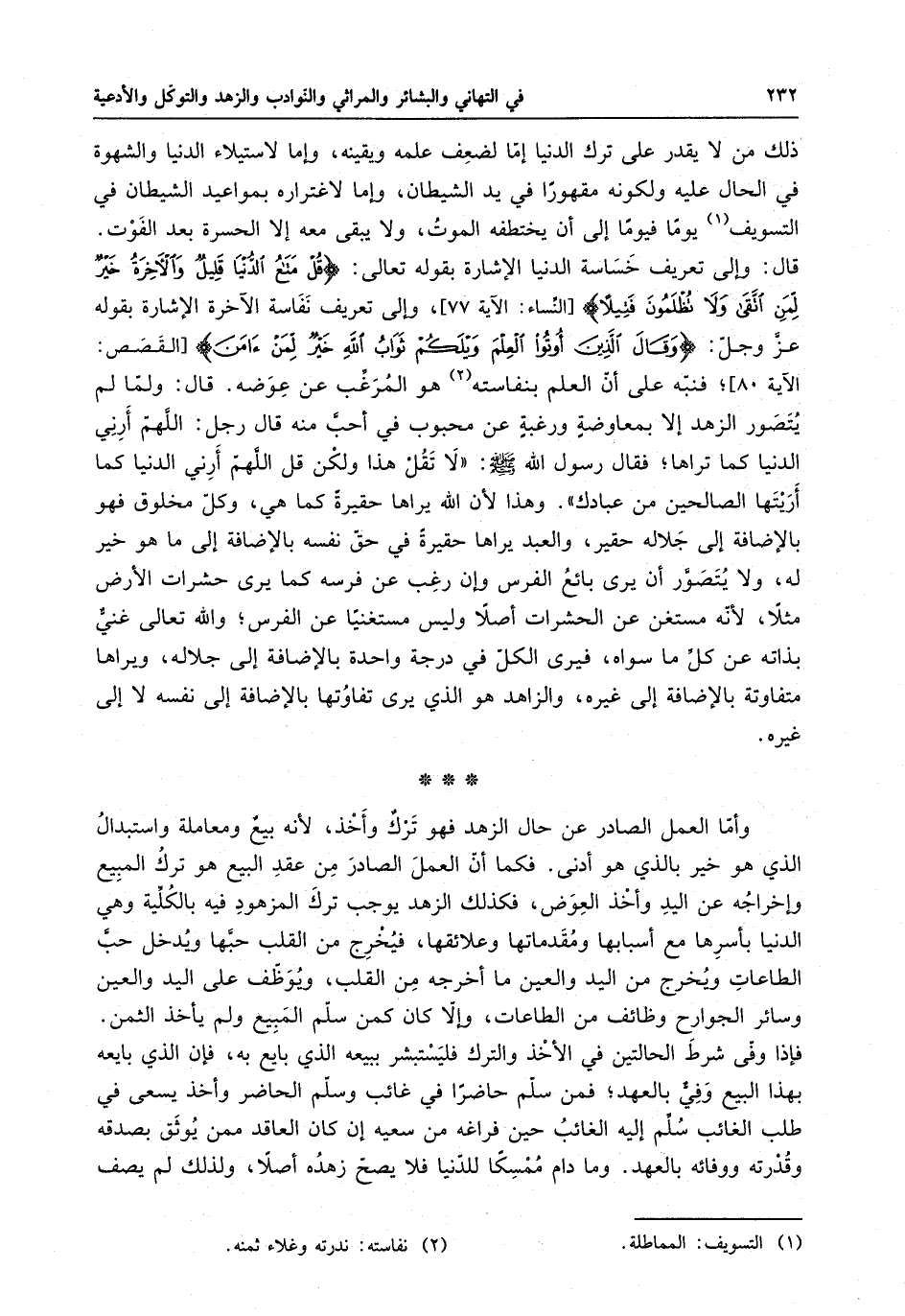 ذلك من لا يقدر على ترك الدنيا إما لضعف علمه ويقينه ، وإما لاستيلاء الدنيا والشهوة في الحال عليه ولكونه مقهوراً في يد الشيطان ، وإما لاغتراره بمواعيد الشيطان في التسويف يوماً فيوماً إلى أن يختطفه الموت ، ولا يبقى معه إلا الحسرة بعد الفوت . قال : وإلى التعريف خساسة الدنيا الإشارة بقوله تعالى : " قل متاع الدنيا قليلٌ والآخرة خيرٌ لمن اتقى ولا تظلمون فتيلاً " ، وإلى تعريف نفاسة الآخرة والإشارة بقوله عز وجل : " وقال الذين أوتوا العلم ويلكم ثواب الله خيرٌ لمن آمن " ، فنبه على أن العلم بنفاسته هو المرغب عن عوضه . قال : ولما لم يتصور الزهد إلا بمعاوضةٍ ورغبةٍ عن محبوبٍ في أحب منه قال رجلٌ : اللهم أرني الدنيا كما تراها ، فقال رسول الله ( صلى الله عليه وسلم ) : " لا تقل هذا ولكن قل اللهم أرني الدنيا كما أريتها الصالحين من عبادك " . وهذا لأن الله يراها حقيرةً كما هي ، وكل مخلوقٍ بالإضافة إلى جلاله حقير ، والعبد يراها حقيرةً في حق نفسه بالإضافة إلى ما هو خيرٌ له ، ولا يتصور أن يرى بائع الفرس وإن رغب عن فرسه كما يرى حشرات الأرض مثلاً ، لأنه مستغنٍ عن الحشرات أصلاً وليس مستغنياً عن الفرس ، و الله تعالى غنيٌ بذاته عن كل ما سواه ، فيرى الكل في درجةٍ واحدةٍ بالإضافة إلى جلاله ، ويراها متفاوتةً بالإضافة إلى غيره ، والزاهد هو الذي يرى تفاوتها بالإضافة إلى نفسه لا إلى غيره . وأما العمل الصادر عن حال الزاهد فهو تركٌ وأخذ ، لأنه بيعٌ ومعاملةٌ واستبدال الذي هو خيرٌ بالذي هو أدنى . فكما أن العمل الصادر من عقد البيع هو ترك المبيع وإخراجه عن اليد وأخذ العوض ، فكذلك الزهد يوجب ترك المزهود فيه بالكلية وهي الدنيا بأسرها مع أسبابها ومقدماتها وعلائقها ، فيخرج من القلب حبها ويدخل حب الطاعات ، وإلا كان كمن سلم المبيع ولم يأخذ الثمن . فإذا وفى شرط الحالتين في الأخذ والترك فليستبشر ببيعه الذي بايع به ، فإن الذي بايعه بهذا البيع وفيٌ بالعهد ، فمن سلم حاضراً في غائبٍ وسلم الحاضر وأخذ يسعى في طلب الغائب سلم إليه الغائب حين فراغه من سعيه إن كان العاقد ممن يوثق بصدقه وقدرته ووفائه بالعهد . ومادام ممسكاً للدنيا فلا يصح زهده أصلاً ، ولذلك لم يصف