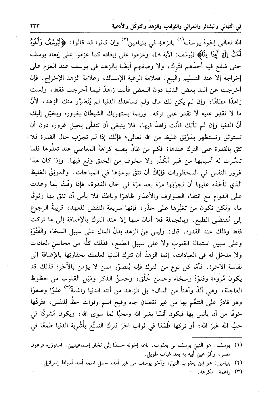الله تعالى إخوة يوسف بالزهد في بنيامين وإن كانوا قد قالوا : " ليوسف وأخوه أحب إلى أبينا منا " ، وعزموا على إبعاده كما عزموا على إبعاد يوسف حتى شفع فيه أحدهم فترك ، ولا وصفهم أيضاً بالزهد في يوسف عند العزم على إخراجه إلا عند التسليم والبيع . فعلامة الرغبة الإمساك ، وعلامة الزهد الإخراج . فإن أخرجت عن اليد بعض الدنيا دون البعض فأنت زاهدٌ فيما أخرجت فقط ، ولست زاهداً مطلقاً ، وإن لم يكن لك مالٌ ولم تساعدك الدنيا لم يتصور منك الزهد ، لأن ما لا تقدر عليه لا تقدر على تركه . وربما يستهويك الشيطان بغروره ويخيل إليك أن الدنيا وإن لم تأتك فأنت زاهدٌ فيها ، فلا ينبغي أن تتدلى بحبل غروره دون أن تستوثق وتستظهر بموثقٍ غليظٍ من الله تعالى ، فإنك إذا لم تجرب حال القدرة فلا تثق بالقدرة على الترك عندها ، فكم من ظانٍ بنفسه كراهة المعاصي عند تعذرها فلما تيسرت لها أسبابها منة غير مكدرو لا مخوف من الخلق وقع فيها . وإذا كان هذا غرور النفس في المحظورات فإياك أن تثق بوعدها في المباحات . والموثق الغليظ الذي تأخذه عليها أن تجربها مرةً بعد مرة في حال القدرة ، فإذا وفت بما وعدت على الدوام مع انتفاء الصوارف والأعذار ظاهراً وباطناً فلا بأس أن تثق بها وثوقاً ما ، ولكن تكون من تغيرها على حذر ، فإنها سريعة النقض للعهد ، قريبة الرجوع إلى مقتضى الطبع . وبالحملة فلا أمان منها إلا عند الترك بالإضافة إلى ما تركت فقط وذلك عند القدرة . قال : وليس من الزهد بذل المال على سبيل السخاء والفتوة وعلى سبيل استمالة القلوب ولا على سبيل الطمع ، فذلك كله من محاسن العادات ولا مدخل له في العبادات ، إنما الزهد أن تترك الدنيا لعلمك بحقارتها بالإضافة إلى نفاسة الآخرة . فأما كل نوعٍ من الترك فإنه يتصور ممن لا يؤمن بالآخرة فذلك قد يكون مروءةً وفتوةً وسخاءً وحسن خلق ، وحسن الذكر وميل القلوب من حظوظ العاجلة ، وهي ألذ وأهنأ من المال ، بل الزاهد من أتته الدنيا راغمةً عفواً وصفواً وهو قادرٌ على التنعم بها من غير نقصان جاهٍ وقبح اسمٍ وفوات حظٍ للنفس ، فتركها خوفاً من أن يأنس بها فيكون آنسا بغير الله ومحباً لما سوى الله ، ويكون مشركاً في حب الله غير الله ، أو تركها طمعاً في ثوابٍ آخر فترك التمتع بأشربة الدنيا طمعاً في