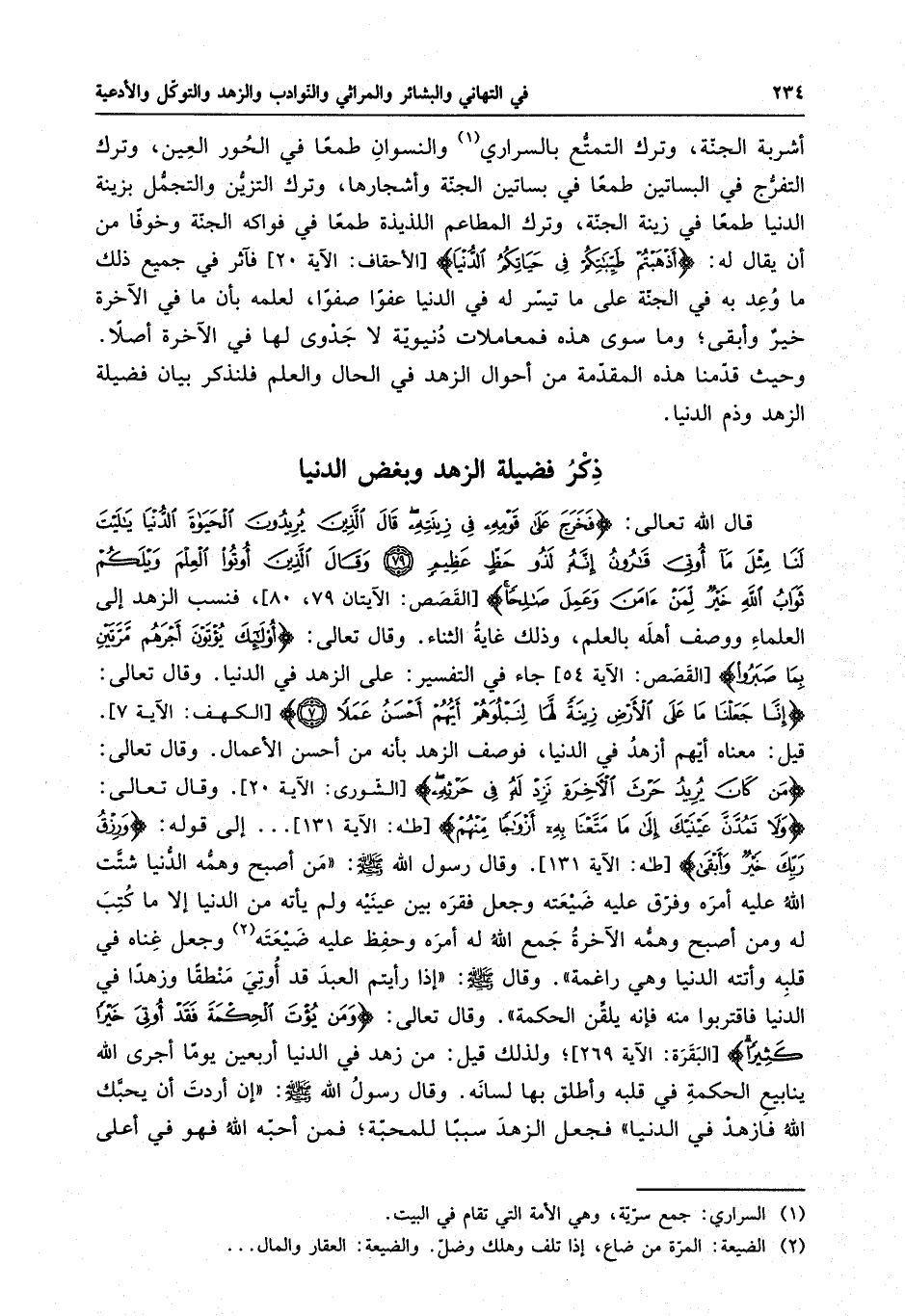 قال الله تعالى : " فخرج على قومه في زينته قال الذين يريدون الحياة الدنيا يا ليت لنا مثل ما أوتي قارون إنه لذو حظٍ عظيم ، وقال الذين أتوا العلم ويلكم ثواب الله خيرٌ لمن آمن وعمل صالحاً " ، فنسب الزهد للعلماء ووصف أهله بالعلم ، وذلك غاية الثناء ، وقال تعالى : " أولئك يؤتون أجرهم مرتين بما صبروا " جاء في التفسير : على الزهد في الدنيا . وقال تعالى : " إنا جعلنا ما على الأرض زينةً لها لنبلوهم أيهم أحسن عملاً " . قيل : معناه أيهم أزهد في الدنيا ، فوصف الزهد بأنه من أحسن الأعمال . وقال تعالى : " من كان يريد حرث الآخرة نزد له في حرثه " . وقال تعالى : " ولا تمدن عينيك إلى ما متعنا به أزواجاً منهم " إلى قوله : " ورزق ربك خيرٌ وأبقى " . وقال رسول الله ( صلى الله عليه وسلم ) : " من أصبح وهمه الدنيا شتت الله عليه أمره وفرق عليه ضيعته وجعل فقره بين عينيه ولم يأته من الدنيا إلا ما كتب له ومن أصبح وهمه الآخرة جمع الله له أمره وحفظ عليه ضيعته وجعل غناه في قلبه وأتته الدنيا وهي راغمةٌ " . وقال ( صلى الله عليه وسلم ) : " إذا رأيتم العبد قد أوتي منطقاً وزهداً في الدنيا فاقتربوا منه فإنه يلقن الحكمة " . وقال تعالى : " ومن يؤت الحكمة فقد أوتي خيراً كثيراً " ، ولذلك قيل : من زهد في الدنيا أربعين يوماً أجرى الله ينابيع الحكمة في قلبه وأطلق بها لسانه . وقال رسول الله ( صلى الله عليه وسلم ) : " إن أردت أن يحبك الله فازهد في الدنيا " فجعل الزهد سبباً للمحبة ، فمن أحبه الله فهو في أعلى