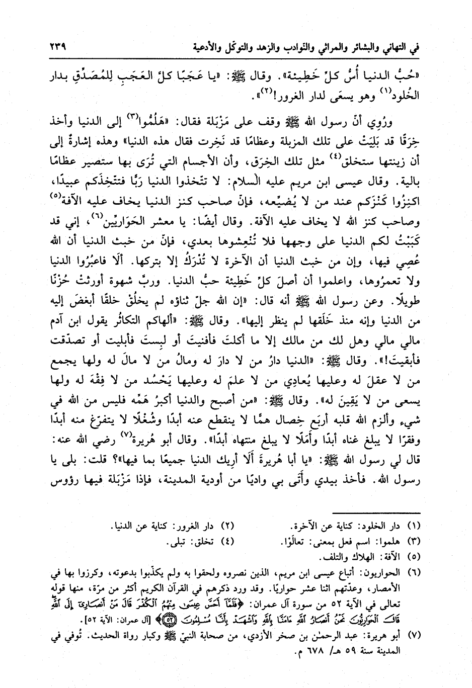وروي أن رسول الله ( صلى الله عليه وسلم ) وقف على مزبلةٍ فقال : " هلموا إلى الدنيا وأخذ خرقاً قد بليت على تلك المزبلة وعظاماً قد نخرت فقال هذه هي الدنيا " وهذه إشارةٌ إلى أن زينتها ستخلق مثل تلك الخرق ، وأن الأجسام التي ترى بها ستصير عظاماً بالية . وقال عيسى بن مريم عليه السلام : " لا تتخذوا الدنيا رباً فتتخذكم عبيداً ، اكنزوا كنزكم عند من لا يضيعه ، فإن صاحب كنز الدنيا يخاف عليه الآفة وصاحب كنز الله لا يخاف عليه الآفة " . وقال أيضاً : " يا معشر الحواريين ، إني قد كببت لكم الدنيا على وجهها فلا تنعشوها بعدي ، فإن من خبث الدنيا أن الله عصي فيها ، وإن من خبث الدنيا أن الآخرة لا تدرك إلا بتركها . ألا فاعبروا الدنيا ولا تعمروها ، واعلموا أن أصل كل خطيئةٍ حب الدنيا . ورب شهوةٍ أورثت حزناً طويلاً . وعن الرسول الله ( صلى الله عليه وسلم ) أنه قال : " إن الله جل ثناؤه لم يخلق خلقاً أبغض إليه من الدنيا وإنه منذ خلقها لم ينظر إليها " . وقال ( صلى الله عليه وسلم ) : " ألهاكم التكاثر يقول ابن آدم مالي مالي وهل لك من مالك إلا ما أكلت فأفنيت أو لبست فأبليت أو تصدقت فأبقيت " . وقال ( صلى الله عليه وسلم ) : " الدنيا دار من لا دار له ومال من لا مال له ولها يجمع من لا عقل له وعليها يعادى من لا علم له وعليها يحسد من لا فقه له ولها يسعى من لا يقين له " . وقال ( صلى الله عليه وسلم ) : من أصبح والدنيا أكبر همه فليس من الله في شيءٍ وألزم الله قلبه أربع خصالٍ هماً لا ينقطع عنه أبداً وشغلاً لا يتفرغ منه أبداً وفقراً لا يبلغ غناه أبداً وأملاً لا يبلغ منتهاه أبداً " . وقال أبو هريرة رضي الله عنه : قال لي رسول الله ( صلى الله عليه وسلم ) : " يا أبا هريرة ألا أريك الدنيا جميعاً بما فيها " ؟ قلت : بلى يا رسول الله . فأخذ بيدي وأتى بي وادياً من أودية المدينة ، فإذا مزبلةٌ فيها رءوس