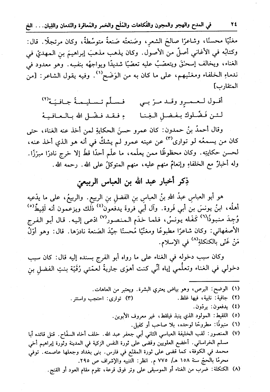 هو أبو العباس عبد الله بن العباس بن الفضل بن ربيع . والربيع ، على ما يدعيه أهله ، ابن يونس بن أبي فروة . وآل أبي فروة يدفعون ذلك ويزعمون أنه لقيطٌ وجد منبوذاً كفله يونس ، فلما خدم المنصور ادعى عليه . قال أبو الفرج الأصفهاني : وكان شاعراً مطبوعاً ومغنياً محسناً جيد الصنعة نادرها . قال : وهو أول من غنى بالكنكلة في الإسلام .