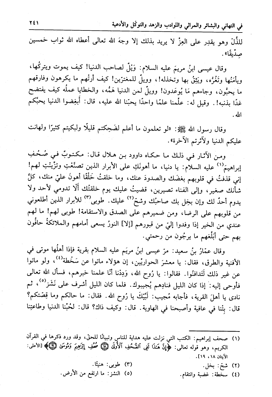 وقال رسول الله ( صلى الله عليه وسلم ) : " لو تعلمون ما أعلم لضحكتم قليلاً ولبكيتم كثيراً ولهانت عليكم الدنيا ولآثرتم الآخرة " . ومن الآثار في ذلك ما حكاه داود بن هلال قال : مكتوبٌ في صحف إبراهيم عليه السلام : يا دنيا ، ما أهونك على الأبرار الذين تصنعت وتزينت لهم إني قذفت في قلوبهم بغضك والصدود عنك ، وما خلقت خلقاً أهون علي منك ، كل شأنك صغير ، وإلى الفناء تصيرين ، قضيت عليك يوم خلقتك ألا تدومي لأحدٍ ولا يدوم أحدٌ لك وإن بخل بك صاحبك وشح عليك . طوبى للأبرار الذين أطلعوني من قلوبهم على الرضا ، ومن ضميرهم على الصدق والاستقامة طوبى لهم مالهم عندي من الخير إذا وفدوا إلى من قبورهم إلا النور يسعى أمامهم والملائكة حافون بهم حتى أبلغهم ما يرجون من رحمتي .