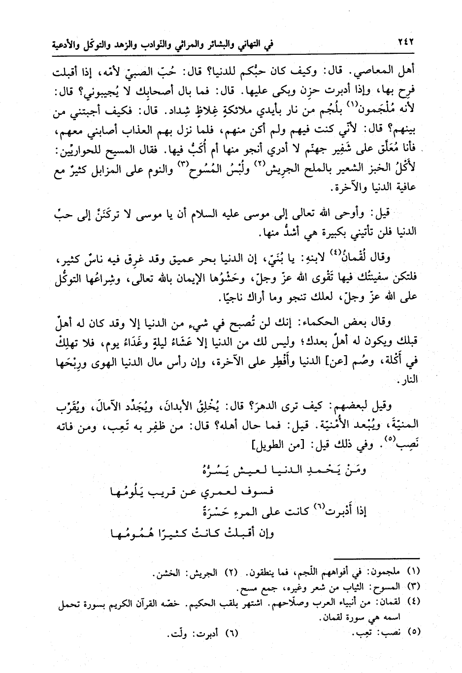 أهل المعاصي . قال : وكيف كان حبكم للدنيا ؟ قال : حب الصبي لأمه ، إذا أقبلت فرح بها ، وإذا أدبرت حزن وبكى عليها . قال : فما بال أصحابك لا يجيبونني ؟ قال : لأنهم ملجمون بلجمٍ من نارٍ بأيدي ملائكةٍ غلاظٍ شداد . قال : فكيف أجبتني من بينهم ؟ قال : لأني كنت فيهم ولم أكن منهم ، فلما نزل بهم العذاب أصابني معهم ، فأنا معلقٌ على شفير جهنم لا أدري أنجو منها أم أكب فيها . فقال المسيح للحواريين : " لأكل الخبز الشعير بالملح الجريش ولبس المسوح والنوم على المزابل كثيرٌ مع عافية الدنيا والآخرة .