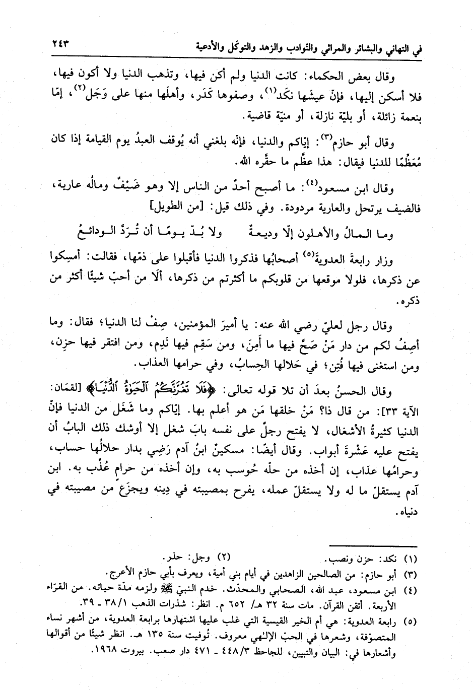 وزار رابعة العدوية أصحابها فذكروا الدنيا فأقبلوا على ذمها ، فقالت : أمسكوا عن ذكرها ، فلو لا موقعها من قلوبكم ما أكثرتم من ذكرها ، ألا من أحب شيئاً أكثر من ذكره .