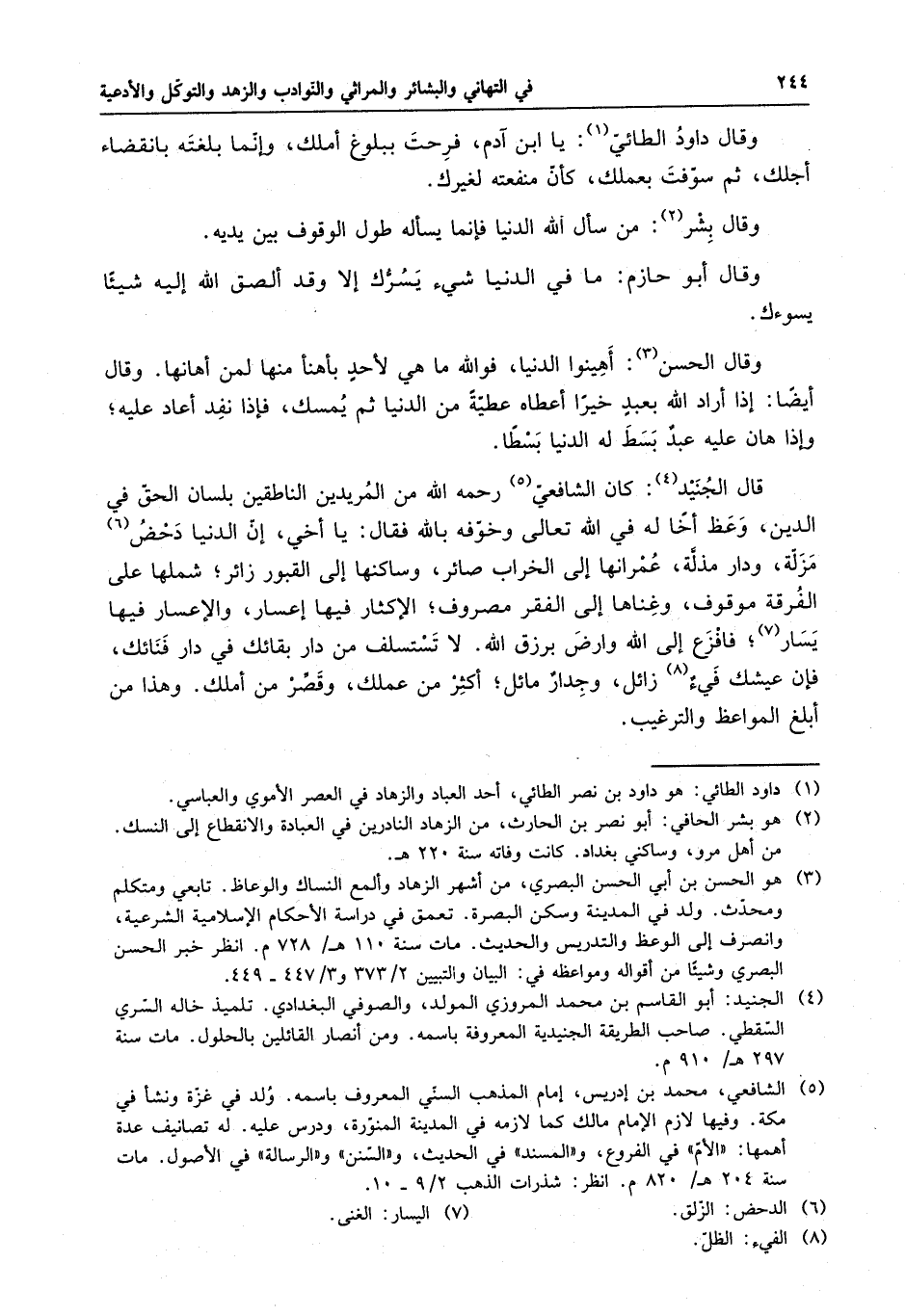 قال الجنيد : كان الشافعي رحمه اله من المريدين الناطقين بلسان الحق في الدين ، وعظ أخاً له في الله تعالى وخوفه بالله فقال : يا أخي ، إن الدنيا دحض مزلة ، ودار مذلة ، عمرانها إلى الخرائب صائر ، وساكنها إلى القبور زائر ، شملها على الفرقة موقوف ، وغناها إلى الفقر مصروف ، الإكثار فيها إعسار ، والإعسار فيها يسار ، فافزع إلى الله وارض برزق الله . لا تستسلف من دار بقائك في دار فنائك ، فإن عيشك فيءٌ زائل ، وجدارٌ مائل ، أكثر من عملك ، وقصر من أملك . وهذا من أبلغ المواعظ والترغيب .