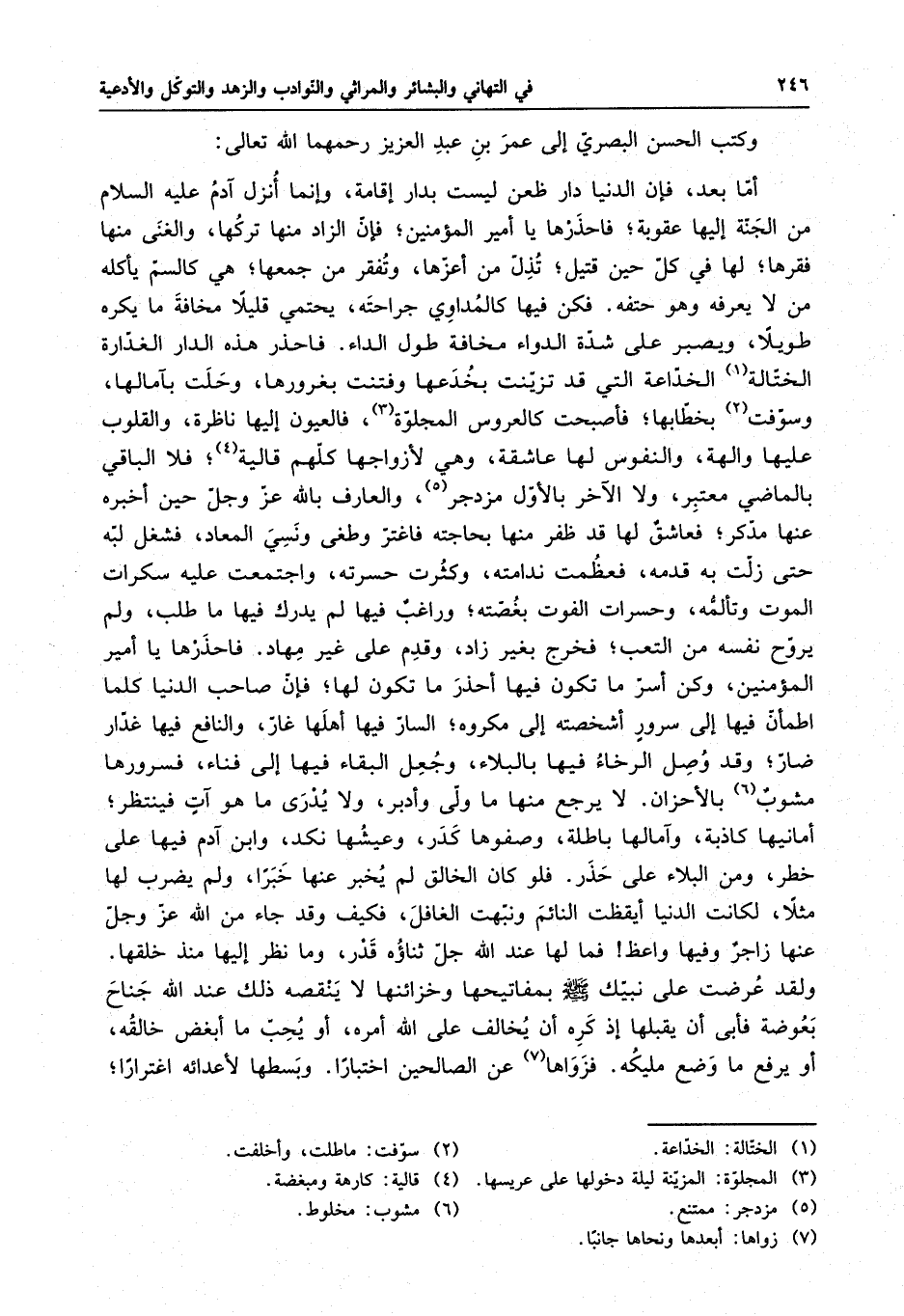 وكتب الحسن البصري إلى عمر بن عبد العزيز رحمهما الله تعالى : أما بعد ، فإن الدنيا دار ظغن ليست بدار إقامة ، وإنما أنزل آدم عليه السلام من الجنة إليها عقوبةً ، فاحذرها يا أمير المؤمنين ، فإن الزاد منها تركها ، والغنى منها فقرها ، لها في كل حينٍ قتيل ، تذل من أعزها ، وتفقر من جمعها ، هي كالسم يأكله من لا يعرفه وهو حتفه . فكن فيها كالمداوي جراحته ، يحتمي قليلاً مخافة ما يكره طويلاً ، ويصبر على شدة الدواء مخافة طول الداء . فاحذر هذه الدار الغدارة الختالة الخداعة التي قد تزينت بخدعها وفتنت بغرورها ، وحلت بآمالها ، وسوفت بخطابها ، فأصبحت كالعروس المجلوة ، فالعيون إليها ناظرة ، والقلوب عليها والهة ، والنفوس لها عاشقة ، وهي لأزواجها كلهم قالية ، فلا الباقي بالماضي معتبر ، ولا الآخر بالأول مزدجر ، والعارف بالله عز وجل حين أخبره عنها مدكر ، فعاشقٌ لها قد ظفر منها بحاجته فاغتر وطغى ونسي المعاد ، فشغل به لبه حتى زلت به قدمه ، فعظمت ندامته ، وكثرت حسرته ، واجتمعت عليه سكرات الموت وتألمه ، وحسرات الفوت بغصته ، وراغبٌ فيها لم يدرك فيها ما طلب ، ولم يروح نفسه من التعب ، فخرج بغير زاد ، وقدم على غير مهاد . فاحذرها يا أمير المؤمنين ، وكن أسر ما تكون فيها أحذر ما تكون لها ، فإن صاحب الدنيا كلما اطمأن إلى سرورٍ أشخصته إلى مكروهٍ ، السار فيها أهلها غار ، والنافع فيها غدارٌ ضار ، وقد وصل الرخاء فيها بالبلاء ، وجعل البقاء فيها إلى فناء ، فسرورها مشوبٌ بالأحزان . لا يرجع منها ما ولى وأدبر ، ولا يدرى ما هو آتٍ فينتظر ، أمانيها كاذبةٌ ، وآمالها باطلةٌ ، وصفوها كدر ، وعيشها نكد ، وابن آدم فيها على خطر ، ومن البلاء على الحذر . فلو كان الخالق لم يخبر عنها خبراً ، ولم يضرب لها مثلاً ، لكانت الدنيا أيقظت النائم ونبهت الغافل ، فكيف وقد جاء من الله عز وجل عنها زاجرٌ وفيها واعظ فما لها عند الله عز وجل ثناؤه قدر ، وما نظر إليها منذ خلقها . ولقد عرضت على نبيك ( صلى الله عليه وسلم ) بمفاتيحها وخزائنها لا ينقصه ذلك عند الله جناح بعوضةٍ فأبى أن يقبلها إذ كره أن يخالف على الله أمره ، أو يحب ما أبغض خالقه ، أو يرفع ما وضع مليكه . فزواها عن الصالحين اختباراً . وبسطها لأعدائه اغتراراً ،