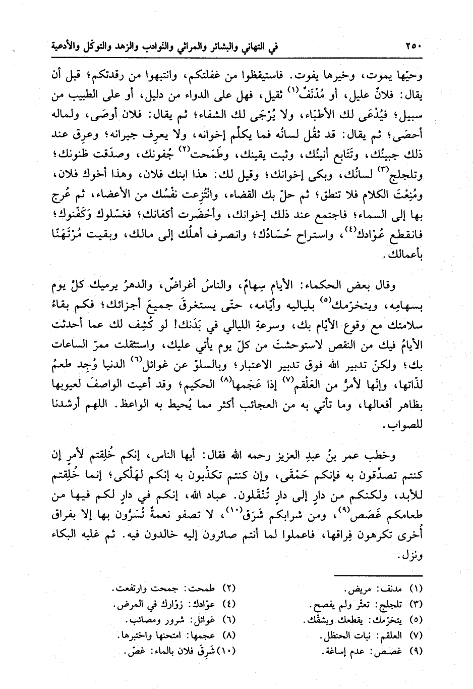 وحيها يموت ، وخيرها يفوت . فاستيقظوا من غفلتكم ، وانتبهوا من رقدتكم قبل أن يقال : فلانٌ عليل ، أو مدنفٌ ثقيل ، فهل على الدواء من دليل ، أو على الطبيب من سبيل ، فيدعى لك الأطباء ، ولا يرجى لك الشفاء ، ثم يقال : فلانٌ أوصى ، ولماله أحصى ، ثم يقال : قد ثقل لسانه فما يكلم إخوانه ، ولا يعرف جيرانه ، وعرق عند ذلك جبينك ، وتتابع أنينك ، وثبت يقينك ، وطمحت جفونك ، وصدقت ظنونك ، وتلجلج لسانك ، وبكى إخوانك ، وقيل لك : هذا ابنك فلان ، وهذا أخوك فلان ، ومنعت الكلام فلا تنطق ، ثم حل بك القضاء ، وانتزعت نفسك من الأعضاء ، ثم عرج بها إلى السماء ، فاجتمع عند ذلك إخوانك ، وأحضرت أكفانك ، فغسلوك وكفنوك ، فانقطع عوادك ، واستراح حسادك ، وانصرف أهلك إلى مالك ، وبقيت مرتهناً بأعمالك .