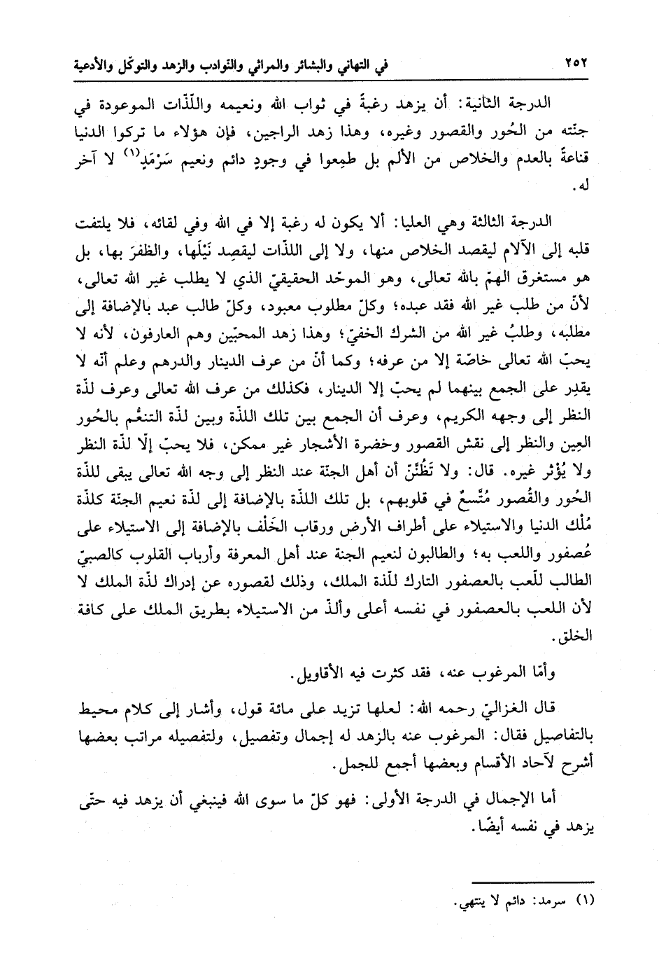 الدرجة الثالثة وهي العليا : ألا يكون له رغبةٌ إلا في الله وفي لقائه ، فلا يلتفت قلبه إلى الآلام ليقصد الخلاص منها ، ولا إلى اللذات ليقصد نيلها والظفر بها ، بل هو مستغرق الهم بالله تعالى ، وهو الموحد الحقيقي الذي لا يطلب غير الله تعالى ، لأن من طلب غير الله فقد عبده ، وكل مطلوبٍ معبود ، وكل طالبٍ عبد بالإضافة إلى مطلبه ، وطلب غير الله فمن الشرك الخفي ، وهذا زهد المحبين وهم العارفون ، لأنه لا يحب الله تعالى خاصة إلا من عرفه ، وكما أن من عرف الدينار والدرهم وعلم أنه لا يقدر على الجمع بينهما لم يحب إلا الدينار ، فلذلك من عرف الله تعالى وعرف للذة النظر إلى وجهه الكريم ، وعرف أن الجمع بين تلك اللذة وبين لذة التنعم بالحور العين والنظر إلى نقش القصور وخضرة الأشجار غير ممكن ، فلا يحب إلا لذة النظر ولا يؤثر غيره . قال : ولا تظنن أن أهل الجنة عند النظر إلى وجه الله تعالى يبقى للذة الحور القصور متسعٌ في قلوبهم ، بل تلك اللذة بالإضافة إلى لذة نعيم الجنة كلذة ملك الدنيا والاستيلاء على أطراف الأرض ورقاب الخلق بالإضافة إلى الاستيلاء على عصفورٍ واللعب به ، والطالبون لنعيم الجنة عند أهل المعرفة وأرباب القلوب كالصبي الطالب للعب بالعصفور في نفسه أعلى وألذ من الاستيلاء بطريق الملك على كافة الخلق .