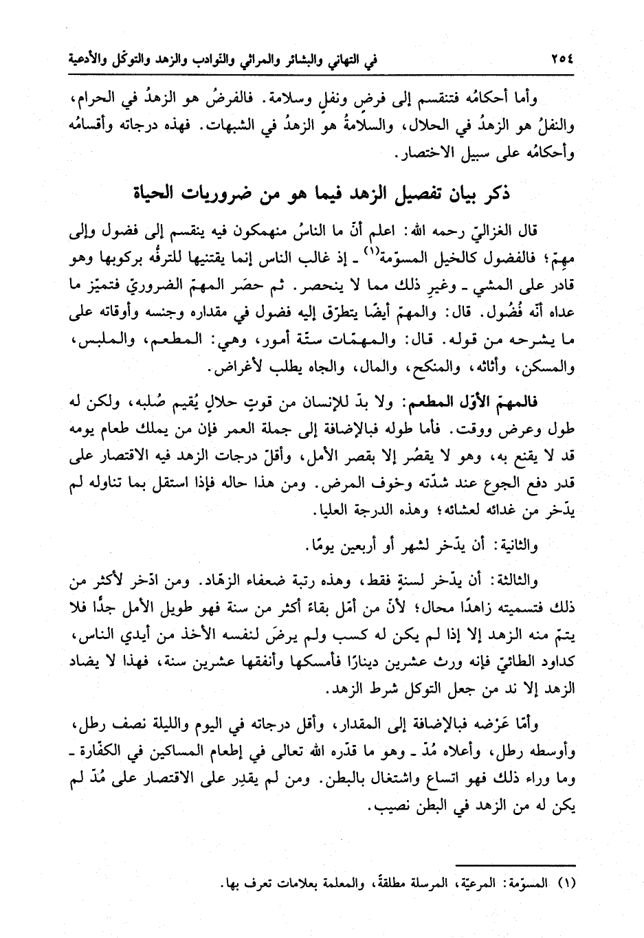 قال الغزالي رحمه الله : اعلم أن ما الناس منهمكون فيه ينقسم إلى فضولٍ وإلى مهم ، فالفضول كالخيل المسومة - إذ غالب الناس إنما يقتنيها للترفه بركوبها وهو قادرٌ على المشي - وغير ذلك مما لا ينحصر . ثم حصر المهم الضروي فتميز ما عداه انه فضولٌ . قال : والمهم أيضاً يتطرق إليه فضولٌ في مقداره وجنسه وأوقاته على ما يشرحه من قوله . قال : والمهمات ستة أمورٍ ، وهي : المطعم ، والملبس ، والمسكن ، وأثاثه ، والمنكح ، والمال ، والجاه يطلب لأغراض .