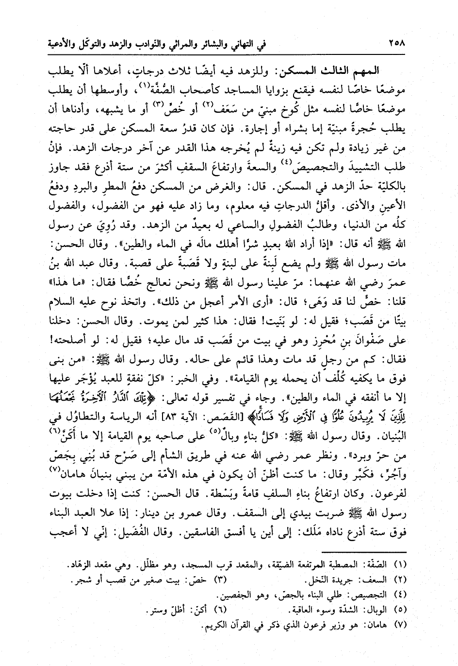 المهم الثالث المسكن . وللزهد فيه أيضاً ثلاث درجاتٍ ، أعلاها ألا يطلب موضعاً خاصاً لنفسه فيقنع بزوايا المساجد كأصحاب الصفة ، وأوسطها أن يطلب موضعاً خاصاً لنفسه مثل كوخٍ مبنيٍ من سعفٍ أو خصٍ أو ما يشبهه ، وأدناها أن يطلب حجرةً مبنيةً إما بشراءٍ أو إجارة . فإن كان قدر سعة المسكن على قدر حاجته من غير زيادةٍ ولم تكن فيه زينةٌ لم يخرجه هذا القدر عن آخر درجات الزهد . فإن طلب التشييد و التجصيص والسعة وارتفاع السقف أكثر من ستة أذرعٍ فقد جاوز بالكلية حد الزهد في المسكن . قال : والغرض من المسكن دفع المطر والبرد ودفع الأعين والأذى . وأقل الدرجات فيه معلوم ، وما زاد عليه فهو من الفضول ، والفضول كله من الدنيا ، وطالب الفضول الساعي له بعيدٌ من الزهد . وقد روي عن رسول الله ( صلى الله عليه وسلم ) أنه قال : " إذا أراد الله بعبدٍ شراً أهلك ماله في الماء والطين " . وقال الحسن : مات رسول الله ( صلى الله عليه وسلم ) ولم يضع لبنةً على لبنة ولا قصبةً على قصبة . وقال عبد الله بن عمر رضي الله عنهما : مر علينا رسول الله ( صلى الله عليه وسلم ) ونحن نعالج خصاً فقال : " ما هذا " قلنا : خصٌ لنا قد وهى ، قال : " أرى الأمر أعجل من ذلك " . واتخذ نوحٌ عليه السلام بيتاً من قصب ، فقيل له : لو بنيت فقال : هذا كثيرٌ لمن يموت . وقال الحسن : دخلنا على صفوان بن محرز وهو في بيتٍ من قصبٍ قد مال عليه ، فقيل له : لو أصلحته فقال : كم من رجلٍ قد مات وهذا قائمٌ على حاله . وقال رسول الله ( صلى الله عليه وسلم ) : " من بنى ما يكفيه كلف أن يحمله يوم القيامة " . وفي الخبر : " كل نفقةٍ للعبد يؤجر عليها إلا ما أنفقه في الماء والطين " . وجاء في تفسير قوله تعالى : " تلك الدار الآخرة نجعلها للذين لا يريدون علواً في الأرض ولا فساداً " أنه الرياسة والتطاول في البنيان . وقال رسول الله ( صلى الله عليه وسلم ) : " كل بناءٍ وبالٌ على صاحبه يوم القيامة إلا ما أكن من حرٍ وبرد " . ونظر عمر رضي الله عنه في طريق الشام إلى صرحٍ قد بني بجصٍ وآجرٍ ، فكبر وقال : ما كنت أظن أن يكون في أمتي من يبني بنيان هامان لفرعون . وكان ارتفاع بناء السلف قامةً وبسطة . قال الحسن : كنت إذا دخلت بيوت رسول الله ( صلى الله عليه وسلم ) ضربت يدي إلى السقف . وقال عمرو بن دينار : إذا على العبد البناء فوق ستة أذرعٍ ناداه ملك : إلى أين يا أفسق الفاسقين . وقال الفضيلي : إني لا أعجب