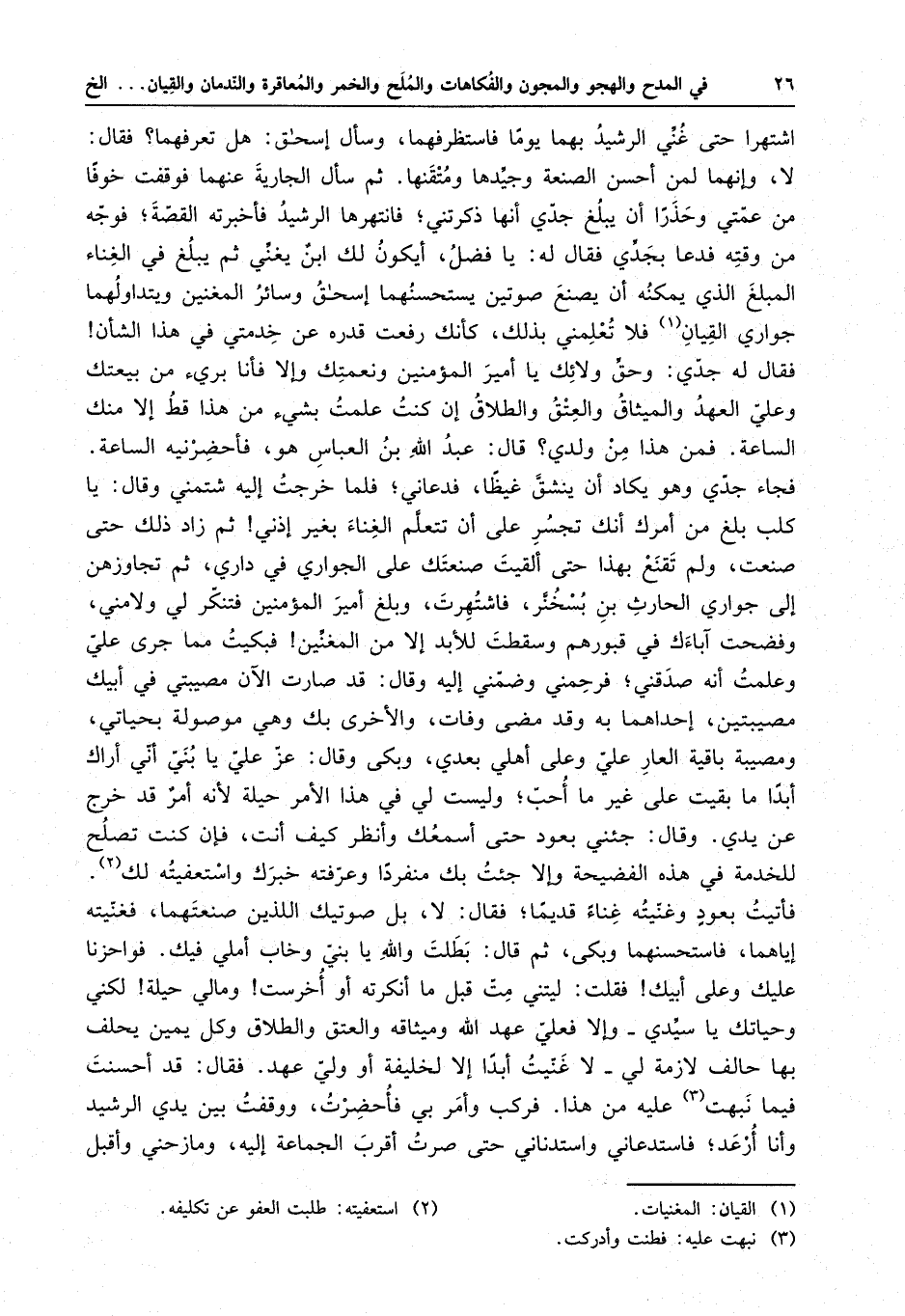 ثم اشتهرا حتى غني الرشيد بهما يوماً فاستظرفهما ، وسأل إسحاق هل تعرفهما ؟ فقال : لا ، وإنهما لمن أحسن الصنعة وجيدها ومتقنها . ثم سأل الجارية عنهما فوقفت خوفاً من عمتي وحذراً أن يبلغ جدي أنها ذكرتني ، فانتهرها الرشيد فأخبرته القصة ، فوجه من وقته فدعا بجدي فقال له : يا فضل ، أيكون لك ابنٌ يغني ثم يبلغ في الغناء المبلغ الذي يمكنه أن يصنع صوتين يستحسنهما إسحاق وسائر المغنين ويتداولهما الجواري القيان فلا تعلمني بذلك ، كأنك رفعت قدره عن خدمتي في هذا الشأن فقال له جدي : وحق ولائك يا أمير المؤمنين ونعمتك وإلا فأنا بريءٌ من بيعتك وعلى العهد والميثاق والعتق والطلاق إن كنت علمت بشيءٍ من هذا قط إلا منك الساعة . فمن هذا من ولدي ؟ قال : عبد الله بن العباس هو ، فأحضرنيه الساعة . فجاء جدي وهو يكاد أن ينشق غيظاً ، فدعاني ، فلما خرجت إليه شتمني وقال : يا كلب بلغ من أمرك أنك تجسر على أن تتعلم الغناء بغير إذني ثم زاد ذلك حتى صنعت ، ولم تقنع بهذا حتى ألقيت صنعتك على الجواري في داري ، ثم تجاوزهن إلى جواري الحارث بن بسخنر ، فاشتهرت ، وبلغ أمير المؤمنين فتنكر لي ولامني ، وفضحت آباءك في قبورهم وسقطت للأبد إلا من المغنين فبكيت مما جرى علي وعلمت أنه صدقني ، فرحمني وضمني إليه وقال : قد صارت الآن مصيبتي في أبيك مصيبتين ، إحداهما به وقد مضى وفات ، والأخرى بك وهي موصولةٌ بحياتي ، ومصيبةٌ باقية العار علي وعلى أهلي بعدي ، وبكى وقال : عز علي يا بني أني أراك أبداً ما بقيت على غير ما أحب ، وليست لي في هذا الأمر حيلةٌ لأنه أمرٌ قد خرج عن يدي . وقال : جئني بعودٍ حتى أسمعك وأنظر كيف أنت ، فإن كنت تصلح للخدمة في هذه الفضيحة وإلا جئت بك منفرداً وعرفته خبرك واستعفيته لك . فأتيت بعودٍ وغنيت غناءً قديماً ، فقال : لا ، بل صوتيك الذين صنعتهما ، فغنيته إياهما ، فاستحسنهما وبكى ، ثم قال : بطلت والله يا بني وخاب أملي فيك . فواحزناً عليك وعلى أبيك فقلت : ليتني مت قبل ما أنكرته أو خرست ومالي حيلة لكني وحياتك يا سيدي - وإلا فعلى عهد الله وميثاقه والعتق والطلاق وكل يمينٍ يحلف بها حالف لازمة لي - لا غنيت أبداً إلا لخليفةٍ أو ولي عهدٍ . فقال : قد أحسنت فيما نبهت عليه من هذا . فركب أمر بي فأحضرت ، ووقفت بين يدي الرشيد وأنا أرعد ، فاستدعاني واستدناني حنى صرت أقرب الجماعة إليه ، ومازحني وأقبل