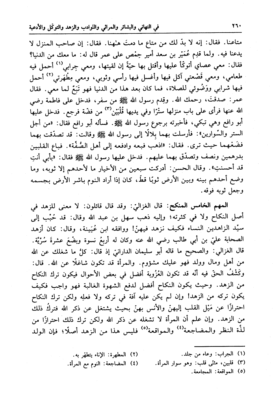 متاعنا . فقال : إنه لا بد لك من متاعٍ ما دمت هاهنا . فقال : إن صاحب المنزل لا يدعنا فيه . ولما قدم عمير بن سعدٍ أمير حمص على عمرٍ قال له : ما معك من الدنيا ؟ فقال : معي عصاي أتوكأ عليها وأقتل بها حيةً إن لقيتها ، ومعي جرابي أحمل فيه طعامي ، ومعي قصعتي آكل فيها وأغسل فيها رأسي وثوبي ، ومعي مطهرتي أحمل فيها شرابي ووضوئي للصلاة ، فما كان بعد هذا من الدنيا فهو تبعٌ لما معي . فقال عمر : صدقت ، رحمك الله . وقدم رسول الله ( صلى الله عليه وسلم ) من سفر ، فدخل على فاطمة رضي الله عنها فرأى على باب منزلها ستراً وفي يدها قلبين من فضةٍ فرجع . فدخل عليها أبو رافعٍ وهي تبكي ، فأخبرته برجوع رسول الله ( صلى الله عليه وسلم ) . فسأله أبو رافعٍ فقال : " من أجل الستر والسوارين " : فأرسلت بهما بلالاً إلى رسول الله ( صلى الله عليه وسلم ) وقالت : قد تصدقت بهما فضعهما حيث ترى . فقال : " اذهب فبعه وادفعه إلى أهل الصفة " . فباع القلبين بدرهمين ونصفٍ وتصدق بهما عليهم . فدخل عليها رسول الله ( صلى الله عليه وسلم ) فقال : " بأبي أنت قد أحسنت " . وقال الحسن : أدركت سبعين من الأخيار ما لأحدهم إلا ثوبه ، وما وضع أحدهم بينه وبين الأرض ثوباً قط ، كان إذا أراد النوم باشر الأرض بجسمه وجعل ثوبه فوقه . المهم الخامس المنكح . قال الغزالي : وقد قال قائلون : لا معنى للزهد في أصل النكاح ولا في كثرته ، وإليه ذهب سهل بن عبد الله وقال : قد حبب إلى سيد الزاهدين النساء فكيف نزهد فيهن ووافقه ابن عينية ، وقال : كان أزهد الصحابة علي بن أبي طالبٍ رضي الله عنه وكان له أربع نسوةٍ وبضع عشرة سرية . قال الغزالي : والصحيح ما قاله أبو سليمان الداراني إذ قال : كل ما شغلك عن الله من أهلٍ ومالٍ وولدٍ فهو عليك مشئوم . والمرأة قد تكون شاغلاً عن الله . قال : وكشف الحق فيه أن قد تكون العزوبة أفضل في بعض الأحوال فيكون ترك النكاح من الزهد . وحيث يكون النكاح أفضل لدفع الشهوة الغالبة فهو واجبٌ فكيف يكون تركه من الزهد وإن لم يكن عليه آفةٌ في تركه ولا فعله ولكن ترك النكاح احترازاً عن ميل القلب إليهن والأنس بهن بحيث يشتغل عن ذكر الله فترك ذلك من الزهد . وإن علم أن المرأة لا تشغله عن ذكر الله ولكن ترك ذلك احترازاً من لذة النظر والمضاجعة والمواقعة فليس هذا من الزهد أصلاً ، فإن الولد