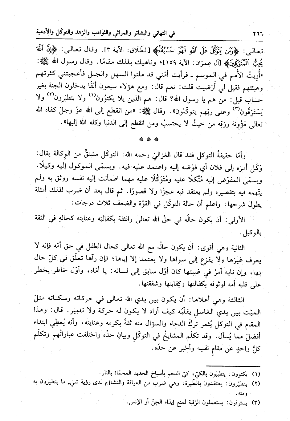 تعالى : " ومن يتوكل على الله فهو حسبه " . وقال تعالى : " إن الله يحب المتوكلين " ، وناهيك بذلك مقاماً . وقال رسول الله ( صلى الله عليه وسلم ) : " أريت الأمم في الموسم فرأيت أمتي قد ملئوا السهل والجبل فأعجبتني كثرتهم وهيئتهم فقيل لي أرضيت قلت نعم قال ومع هؤلاء سبعون ألفاً يدخلون الجنة بغير حسابٍ قيل من هم يا رسول الله قال هم الذين لا يكتوون ولا يتطيرون ولا يسترقون وعلى ربهم يتوكلون " . وقال ( صلى الله عليه وسلم ) : " من انقطع إلى الله عز وجل كفاه الله تعالى مئونة رزقه من حيث لا يحتسب ومن انقطع إلى الدنيا وكله الله إليها " . وأما حقيقة التوكل فقد قال الغزالي رحمه الله : التوكل مشتقٌ من الوكالة يقال : وكل أمره إلى فلانٍ أي فوضه إليه واعتمد عليه فيه . ويسمى الموكول إليه وكيلاً ، ويسمى المفوض إليه متكلاً عليه ومتوكلاً عليه مهما اطمأنت إليه نفسه ووثق به ولم يتهمه فيه بتقصيره ولم يعتقد فيه عجزاً ولا قصوراً . ثم قال بعد أن ضرب لذلك أمثلةً يطول شرحها : واعلم أن حالة التوكل في القوة والضعف ثلاث درجاتٍ : الأولى : أن يكون حاله في حق الله تعالى والثقة بكفالته وعنايته كحاله في الثقة بالوكيل .