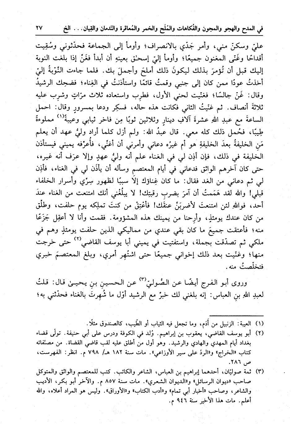 علي وسكن مني ، وأمر جدي بالانصراف ، وأومأ إلى الجماعة فحدثوني وسقيت أقداحاً وغنى المغنون جميعاً ، وأومأ إلى إسحاق بعينيه أن أبدأ فغن إذا بلغت النوبة إليك قبل أن تؤمر بذلك ليكون أملح وأجمل بك . فلما جاءت النوبة إلي أخذت عوداً ممن كان إلى جنبي وقمت قائماً واستأذنت في الغناء ، فضحك الرشيد وقال : غن جالساً ، فغنيت لحني الأول ، فطرب واستعاده ثلاث مراتٍ وشرب عليه ثلاثة أنصاف . ثم غنيت الثاني فكانت هذه حاله ، فسكر ودعا بمسرورٍ وقال : احمل الساعة مع عبد الله عشرة آلاف دينارٍ وثلاثين ثوباً من فاخر ثيابي وعيبةً مملوءةً طيباً ، فحمل ذلك كله معي . قال عبد الله : ولم أزل كلما أراد ولي عهد أن يعلم من الخليفة بعد الخليفة هو أم غيره دعاني وأمرني أن أغني ، فأعرفه يميني فيستأذن الخليفة في ذلك ، فإن أذن لي في الغناء علم أنه ولي عهدٍ وإلا عرف أنه غيره ، حتى كان آخرهم الواثق فدعاني في أيام المعتصم وسأله أن يأذن لي في الغناء ، فأذن لي ثم دعاني من الغد فقال : ما كان غناؤك إلا سبباً لظهور سري وأسرار الخلفاء قبلي والله لقد هممت أن آمر بضرب رقبتك لا يبلغني أنك امتنعت من الغناء عند أحد ، فوالله لئن امتنعت لأضربن عتقك فأعتق من كنت تملكه يوم حلفت ، وطلق من كان عندك يومئذٍ ، وأرحنا من يمينك هذه المشئومة . فقمت وأنا لا أعقل جزعاً منه ، فأعتقت جميع ما كان بقي عندي من مماليكي الذين حلفت يومئذٍ وهم في ملكي ثم تصدقت بجملة ، واستفتيت في يميني أبا يوسف القاضي حتى خرجت منها ، وغنيت بعد ذلك إخواني جميعاً حتى اشتهر أمري ، وبلغ المعتصم خبري فتخلصت منه . ي فتخلصت منه .