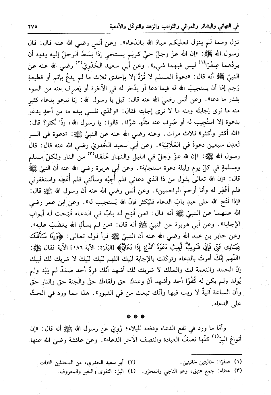 نزل ومما لم ينزل فعليكم عباد الله بالدعاء " . وعن أنسٍ رصي الله عنه قال ، قال رسول الله ( صلى الله عليه وسلم ) : " إن الله عز وجل حيٌ كريمٌ يستحي إذا بسط الرجل إليه يديه أن يردهما صفراً ليس فيهما شيء " . وعن أبي سعيد الخدري رضي الله عنه عن النبي ( صلى الله عليه وسلم ) أنه قال : " دعوة المسلم لا ترد إلا بإحدى ثلاثٍ ما لم يدع بإثمٍ أو قطيعة رحمٍ إما أن يستجيب الله له فيما دعا أو يدخر له في الآخرة أو يصرف عنه من السوء بقدر ما دعا " . وعن أنسٍ رضي الله عنه قال : قيل يا رسول الله : إنا ندعوا بدعاءٍ كثيرٍ منه ما نرى إجابته ومنه ما لا نرى إجابته فقال : " والذي نفسي بيده ما من أحدٍ يدعو بدعوةٍ إلا استجيب له أو صرف عنه مثلها شراً " . قالوا : يا رسول الله إذاً نكثر ؟ قال : " الله أكثر وأكثر " ثلاث مرات . وعنه رضي الله عنه عن النبي ( صلى الله عليه وسلم ) : " دعوةٌ في السر تعدل سبعين دعوةً في العلانية " . وعن أبي سعيدٍ الخدري رضي الله عنه قال : قال رسول الله ( صلى الله عليه وسلم ) : " إن لله عز وجل في الليل والنهار عتقاء من النار ولكل مسلمٍ ومسلمةٍ في كل يومٍ وليلةٍ دعوةٌ مستجابة " . وعن أبي هريرة رضي الله عنه أن النبي ( صلى الله عليه وسلم ) قال : " إن الله تعالى يقول من ذا الذي دعاني فلم أجبه وسألني فلم أعطه واستغفرني فلم أغفر له وأنا أرحم الراحمين " . وعن أنسٍ رضي اله عنه أن رسول الله ( صلى الله عليه وسلم ) قال : " إذا فتح الله على عبدٍ باب الدعاء فليكثر فإن الله يستجيب له " . وعن ابن عمر رضي الله عنهما عن النبي ( صلى الله عليه وسلم ) أنه قال : " من فتح له بابٌ في الدعاء فتحت له أبواب الإجابة " . وعن أبي هريرة عن النبي ( صلى الله عليه وسلم ) أنه قال : " من لم يسأل الله يغضب عليه " . وعن جابرٍ بن عبد الله رضي الله عنه أن النبي ( صلى الله عليه وسلم ) قرأ قوله تعالى : " وإذا سألك عبادي عني فإني قريبٌ أجيب دعوة الداع إذا دعان " الآية فقال ( صلى الله عليه وسلم ) : " اللهم إنك أمرت بالدعاء وتوكلت بالإجابة لبيك اللهم لبيك لبيك لا شريك لك لبيك إن الحمد والنعمة لك والملك لا شريك لك أشهد أنك فردٌ أحدٌ صمدٌ لم يلد ولم يولد ولم يكن له كفواً أحد وأشهد أن وعدك حقٌ ولقاءك حقٌ والجنة حقٌ والنار حقٌ وأن الساعة آتيةٌ لا ريب فيها وأنك تبعث من القبور " . هذا مما ورد في الحث على الدعاء .