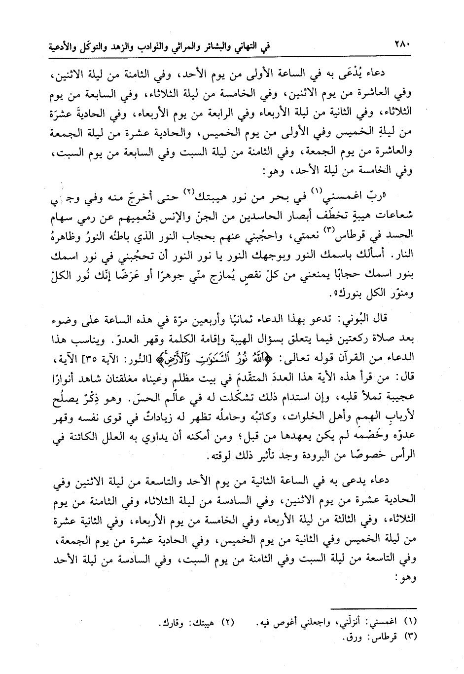 دعاءٌ يدعى به في الساعة الأولى من يوم الأحد ، وفي الثامنة من ليلة الاثنين ، وفي العاشرة من يوم الاثنين ، وفي الخامسة من ليلة الثلاثاء ، وفي السابعة من يوم الثلاثاء ، وفي الثانية من ليلة الأربعاء وفي الرابعة من يوم الأربعاء ، والحادية عشرة من ليلة الخميس ، والحادية عشرة من ليلة الجمعة والعاشرة من يوم الجمعة ، وفي الثامنة من ليلة السبت وفي السابعة من يوم السبت ، وفي الخامسة من ليلة الأحد ، وهو : " رب اغمسني في بحرٍ من نور هيبتك حتى أخرج منه وفي وجهي شعاعات هيبةٍ تخطف أبصار الحاسدين من الجن والإنس فتعميهم عن رمي سهام الحسد في قرطاس نعمتي ، واحجبني عنهم بحجاب النور الذي باطنه النور وظاهره النار . أسألك باسمك النور وبوجهك النور يا نور النور أن تحجبني في نور اسمك حجاباً يمنعني من كل نقصٍ يمازج مني جوهراً أو عرضاً إنك نور الكل ومنور الكل بنورك " . قال البوني : تدعو بهذا الدعاء ثمانياً وأربعين مرةً في هذه الساعة على وضوءٍ بعد صلاة ركعتين فيما يتعلق بسؤال الهيبة وإقامة الكلمة وقهر العدو . ويناسب هذه الدعاء من القرآن قوله تعالى : " الله نور السماوات والأرض " الآية ، قال : من قرأ هذه الآية هذا العدد المتقدم في بيتٍ مظلمٍ وعيناه مغلقتان شاهد أنواراً عجيبةً تملأ قلبه ، وإن استدام ذلك تشكلت له في عالم الحس . وهو ذكرٌ يصلح لأرباب الهمم وأهل الخلوات ، وكاتبه وحامله تظهر له زياداتٌ في قوى نفسه وقهر عدوه وخصمه لم يكن يعدها من قبل ، ومن أمكنه أن يداوي به العلل الكائنة في الرأس خصوصاً من البرودة وجد تأثير ذلك لوقته .