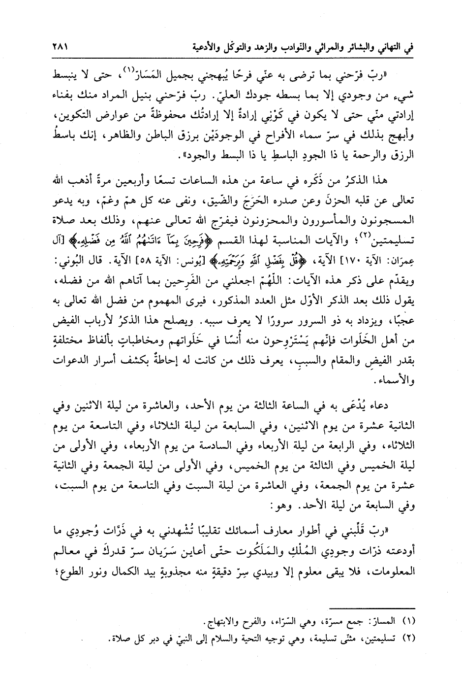 " رب فرحني بما ترضى به عني فرحاً يبهجني بجميل المسار ، حتى لا ينبسط شيءٌ من وجودي إلا بما بسطه جودك العلي . رب فرحني بنيل المراد منك بفناء إرادتي مني حتى لا يكون في كوني إرادةٌ إلا إرادتك محفوظةً من عوارض التكوين ، وأبهج بذلك في سر سماء الأفراح في الوجودين برزق الباطن والظاهر ، إنك باسط الرزق والرحمة يا ذا الجود الباسط يا ذا البسط والجود " .