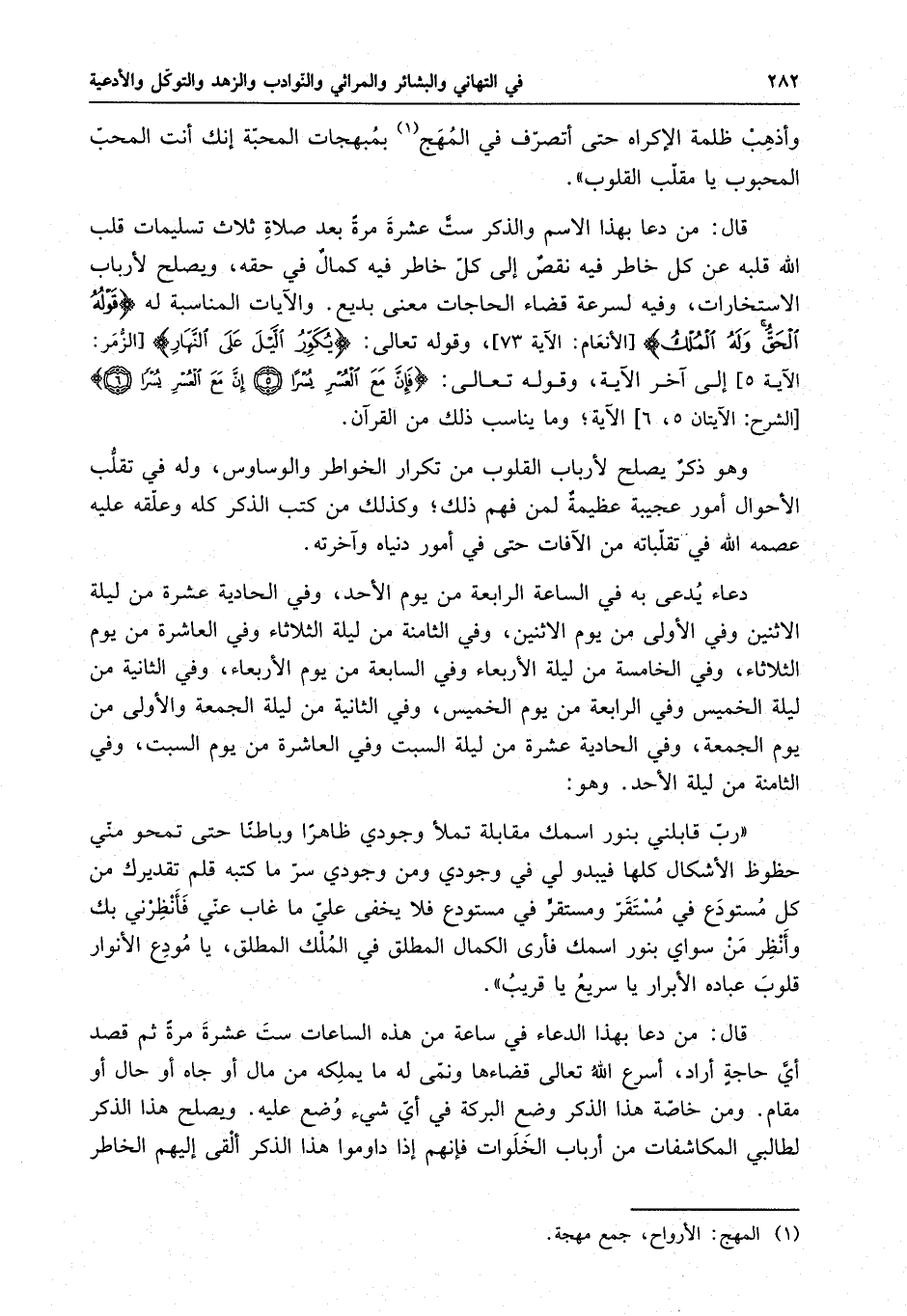 وهو ذكرٌ يصلح لأرباب القلوب من تكرار الخواطر والوساوس ، وله في تقلب الأحوال أمورٌ عجيبةٌ عظيمةٌ لمن فهم ذلك ، وكذلك من كتب الذكر كله وعلقه عليه عصمه الله في تقلباته من الآفات حتى في أمور دنياه وآخرته . دعاءٌ يدعى به في الساعة الرابعة من يوم الأحد ، وفي الحادية عشرة من ليلة الاثنين وفي الأولى من يوم الاثنين ، وفي الثامنة من ليلة الثلاثاء وفي العاشرة من يوم الثلاثاء ، وفي الخامسة من ليلة الأربعاء وفي السابعة من يوم الأربعاء ، وفي الثانية من ليلة الخميس وفي الرابعة من يوم الخميس ، وفي الثانية من ليلة الجمعة والأولى من يوم الجمعة ، وفي الحادية عشر من ليلة السبت وفي العاشرة من يوم السبت ، وفي الثامنة من ليلة الأحد . وهو : " رب قابلني بنور اسمك مقابلةً تملئ وجودي ظاهراً وباطناً حتى تمحو مني حظوظ الأشكال كلها فيبدوا لي في وجودي ومن وجودي سر ما كتبه قلم تقديرك من كل مستودعٍ في مستقرٍ ومستقرٍ في مستودعٍ فلا يخفى علي ما غاب عني فأنظرني بك وأنظر من سواي بنور اسمك فأرى الكمال المطلق في الملك المطلق ، يا مودع الأنوار قلوب عباده الأبرار يا سريع يا قريب " .