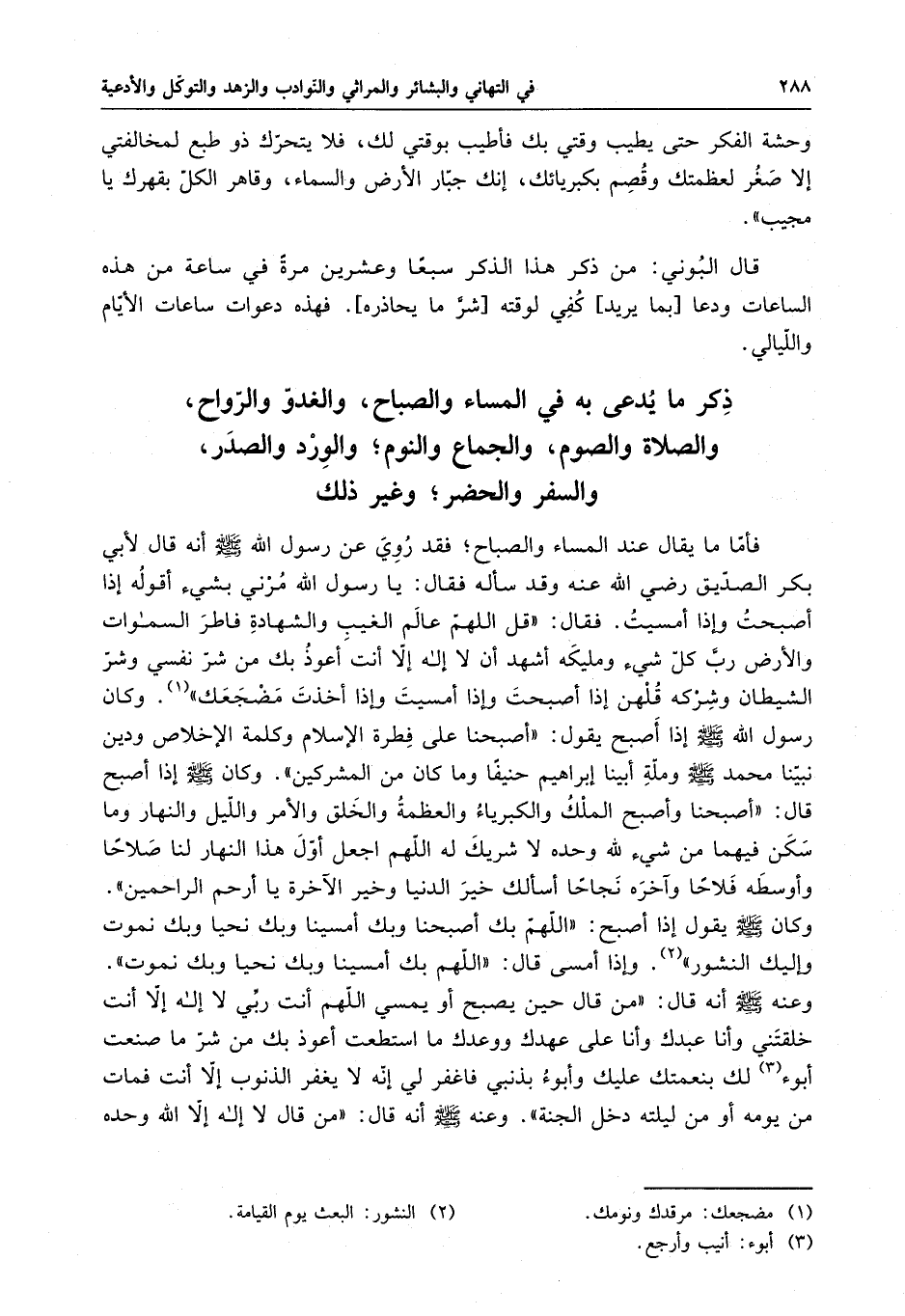ذكر ما يدعى به في المساء والصباح والغدو والرواح والصلاة والصوم ، والجماع والنوم ، والورد والصدر ، والسفر والحضر ، وغير ذلك