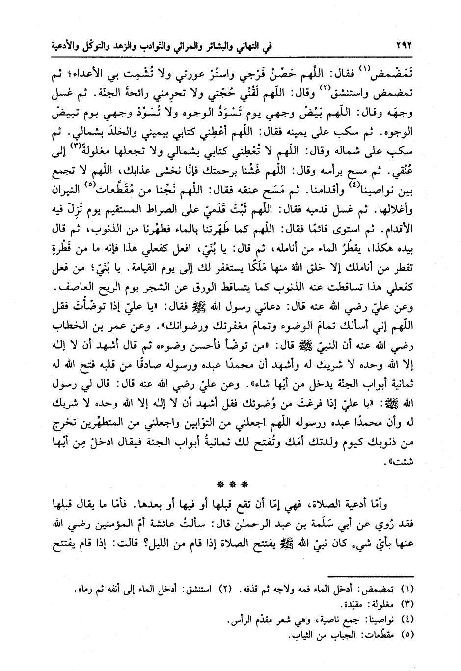 تمضمض فقال : اللهم حصن فرجي واستر عورتي ولا تشمت بي الأعداء ، ثم تمضمض واستنشق وقال : اللهم لقني حجتي ولا تحرمني رائحة الجنة . ثم غسل وجهه وقال : اللهم بيض وجهي يوم تسود الوجوه ولا تسود وجهي يوم تبيض الوجوه . ثم سكب على يمينه فقال : اللهم أعطني كتابي بيميني والخلد بشمالي . ثم سكب على شماله اللهم لا تعطني كتابي بشمالي ولا تجعلها مغلولة إلى عنقي ثم مسح برأسه وقال : اللهم غشنا برحمتك فإنا نخشى عذابك ، اللهم لا تجمع بين نواصينا وأقدامنا . ثم مسح عنقه فقال : اللهم نجنا من مقطعات النيران وأغلالها . ثم غسل قدميه فقال : اللهم ثبت قدمي على الصراط المستقيم يوم تزل فيه الأقدام . ثم استوى قائماً فقال : اللهم كما طهرتنا بالماء فطهرنا من الذنوب ، ثم قال بيده هكذا ، يقطر الماء من أنامله ، ثم قال : يا بني ، افعل كفعلي هذا فإنه ما من قطرةٍ تقطر من أناملك إلا خلق الله منها ملكاً يستغفر لك إلى يوم القيامة . يا بني ، من فعل كفعلي هذا تساقطت عنه الذنوب كما يتساقط الورق عن الشجر يوم الريح العاصف . وعن عليٍ رضي الله عنه قال : دعاني رسول الله ( صلى الله عليه وسلم ) فقال : " يا عليٌ إذا توضأت فقل اللهم إني أسألك تمام الوضوء وتمام مغفرتك ورضوانك " . وعن عمر بن الخطاب رضي الله عنه أن النبي ( صلى الله عليه وسلم ) قال : " من توضأ فأحسن وضوءه ثم قال أشهد أن لا إله إلا الله وحده لا شريك له وأشهد أن محمداً عبده ورسوله صادقاً من قلبه فتح الله له ثمانية أبواب الجنة يدخل من أيها يشاء " . وعن عليٍ رضي الله عنه قال : قال لي رسول الله ( صلى الله عليه وسلم ) : " يا علي إذا فرغت من وضوئك فقل أشهد أن لا إله إلا الله وحده لا شريك له وأن محمداً عبده ورسوله اللهم اجعلني من التوابين واجعلني من المتطهرين تخرج من ذنوبك كيوم ولدتك أمك وتفتح لك ثمانية أبواب الجنة فيقال ادخل من أيها شئت " .