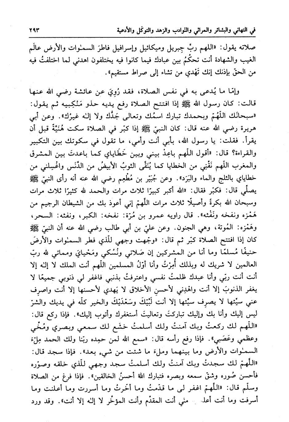 صلاته يقول : " اللهم رب جبريل وميكائيل وإسرافيل فاطر السماوات والأرض عالم الغيب والشهادة أنت تحكم بين عبادك فيما كانوا فيه يختلفون اهدني لما اختلفت فيه من الحق بإذنك إنك تهدي من تشاء إلى صراطٍ مستقيم " . وأما ما يدعى به في نفس الصلاة ، فقد روي عن عائشة رضي الله عنها قالت : كان رسول الله ( صلى الله عليه وسلم ) إذا افتتح الصلاة رفع يديه حذو منكبيه ثم يقول : " سبحانك اللهم وبحمدك تبارك اسمك وتعالى جدك ولا إله غيرك " . وعن أبي هريرة رضي الله عنه قال : كان النبي ( صلى الله عليه وسلم ) إذا كبر في الصلاة سكت هنيهةً قبل أن يقرأ . فقلت : " يا رسول الله ، بأبي أنت وأمي ، ما تقول في سكوتك بين التكبير والقراءة ؟ قال : " أقول اللهم باعد بيني وبين خطاياي كما باعدت بين المشرق والمغرب اللهم نقني من الخطايا كما ينقى الثوب الأبيض من الدنس واغسلني من خطاياي بالثلج والماء والبرد " . وعن جبير بن مطعم رضي الله عنه أنه رأى النبي ( صلى الله عليه وسلم ) يصلي قال : فكبر فقال : " الله أكبر كبيراً ثلاث مراتٍ والحمد لله كثيراً ثلاث مراتٍ وسبحان الله بكرةً وأصيلاً ثلاث مراتٍ اللهم إني أعوذ بك من الشيطان الرجيم من همزه ونفخه ونفثه " . قال راويه عمرو بن مرة : نفخه : الكبر ، ونفثه : السحر ، وهمزه : الموتة ، وهي الجنون . وعن علي بن أبي طالب رضي الله عنه أن النبي ( صلى الله عليه وسلم ) كان إذا افتتح الصلاة كبر ثم قال : " وجهت وجهي للذي فطر السماوات والأرض حنيفاً مسلماً وما أنا من المشركين إن صلاتي ونسكي ومحياي ومماتي لله رب العالمين لا شريك له وبذلك أمرت وأنا أول المسلمين اللهم أنت الملك لا إله إلا أنت أنت ربي وأنا عبدك ظلمت نفسي واعترفت بذنبي فاغفر لي ذنوبي جميعاً لا يغفر الذنوب إلا أنت واهدني لأحسن الأخلاق لا يهدي لأحسنها إلا أنت واصرف عني سيئها لا يصرف سيئها إلا أنت لبيك وسعديك والخير كله في يديك والشر ليس إليك وأنا بك وإليك تباركت وتعاليت أستغفرك وأتوب إليك " . فإذا ركع قال : " اللهم لك ركعت وبك آمنت ولك أسلمت خشع لك سمعي وبصري ومخي وعظمي وعصبي " . فإذا رفع رأسه قال : " سمع الله لمن حمده ربنا ولك الحمد ملء السماوات والأرض وما بينهما وملء ما شئت من شيءٍ بعد " . فإذا سجد قال : " اللهم لك سجدت وبك آمنت ولك أسلمت سجد وجهي للذي خلقه وصوره فأحسن صوره وشق سمعه وبصره فتبارك الله أحسن الخالقين " . فإذا فرغ من الصلاة وسلم قال : " اللهم اغفر لي ما قدمت وما أخرت وما أسررت وما أعلنت وما أسرفت وما أنت به أعلم مني أنت المقدم وأنت المؤخر لا إله إلا أنت " . وقد ورد