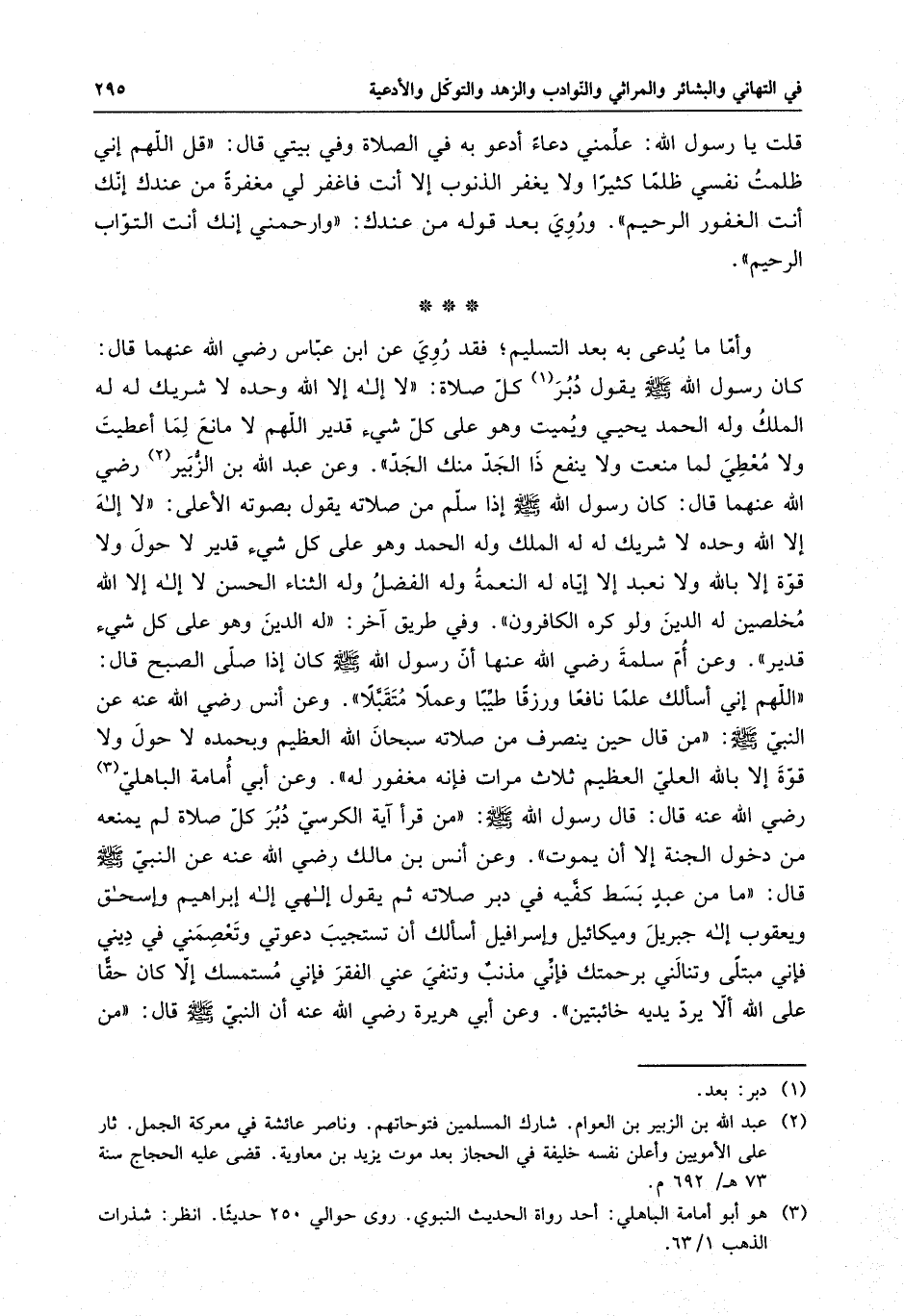 قلت يا رسول الله : علمني دعاءً أدعو به في الصلاة وفي بيتي قال : " قل اللهم إني ظلمت نفسي ظلماً كثيراً ولا يغفر الذنوب إلا أنت فاغفر لي مغفرةً من عندك إنك أنت الغفور الرحيم " . وروى بعد قوله من عندك : " وارحمني إنك أنت التواب الرحيم " . حمدٍ كما صليت على إبراهيم وآل إبراهيم إنك حميد مجيد وبارك على محمدٍ وعلى آل محمدٍ كما باركت على إبراهيم وآل إبراهيم إنك حميد مجيد " . وعن أبي هريرة رضي الله عنه قال : رسول الله ( صلى الله عليه وسلم ) : " إذا فرغ أحدكم من التشهد فليتعوذ بالله من أربعٍ : من عذاب جهنم وعذاب القبر وفتنة المحيا والممات وشر المسيح الدجال " . وعن عبد الله بن عمرو بن العاص أن أبا بكرٍ الصديق رضي الله عنه قال : قلت يا رسول الله : علمني دعاءً أدعو به في الصلاة وفي بيتي قال : " قل اللهم إني ظلمت نفسي ظلماً كثيراً ولا يغفر الذنوب إلا أنت فاغفر لي مغفرةً من عندك إنك أنت الغفور الرحيم " . وروى بعد قوله من عندك : " وارحمني إنك أنت التواب الرحيم " . وأما ما يدعى به بعد التسليم ، فقد روي عن ابن عباسٍ رضي الله عنهما قال : كان رسول الله ( صلى الله عليه وسلم ) يقول دبر كل صلاةٍ : " لا إله إلا الله وحده لا شريك له له الملك وله الحمد يحيي يميت وهو على كل شيءٍ قدير اللهم لا مانع لما أعطيت ولا معطي لما منعت ولا ينفع ذا الجد منك الجد " . وعن عبد الله بن الزبير رضي الله عنهما قال : كان رسول الله ( صلى الله عليه وسلم ) إذا سلم من صلاته يقول بصوته الأعلى : " لا إله إلا الله وحده لا شريك له له الملك وله الحمد وهو على كل شيءٍ قدير لا حول ولا قوة إلا بالله ولا نعبد إلا إياه له النعمة وله الفضل وله الثناء الحسن لا إله إلا الله مخلصين له الدين ولو كره الكافرون " . وفي طريقٍ آخر : " له الدين وهو على كل شيءٍ قدير " . وعن أم سلمة رضي الله عنها أن رسول الله ( صلى الله عليه وسلم ) كان إذا صلى الصبح قال : " اللهم إني أسألك علماً نافعاً ورزقاً طيباً وعملاً متقبلاً " . وعن أنسٍ رضي الله عنه عن النبي ( صلى الله عليه وسلم ) : " من قال حين ينصرف من صلاته سبحان الله العظيم وبحمده لا حول ولا قوة إلا بالله العلي العظيم ثلاث مراتٍ فإنه مغفورٌ له " . وعن أبي أمامة الباهلي رضي الله عنه قال : قال رسول الله ( صلى الله عليه وسلم ) : " من قرأ آية الكرسي دبر كل صلاةٍ لم يمنعه من دخول الجنة إلا أن يموت " . وعن أنس بن مالكٍ رضي الله عنه عن النبي ( صلى الله عليه وسلم ) قال : " ما من عبدٍ بسط كفيه في دبر صلاته ثم يقول إلهي إله إبراهيم وإسحاق ويعقوب إله جبريل وميكائيل وإسرافيل أسألك أن تستجيب دعوتي وتعصمني في ديني فإني مبتلًى وتنالني برحمتك فإني مذنبٌ وتنفي عني الفقر فإني مستمسك إلا كان حقاً على الله ألا يرد يديه خائبتين " . وعن أبي هريرة رضي الله عنه أن النبي ( صلى الله عليه وسلم ) قال : " من