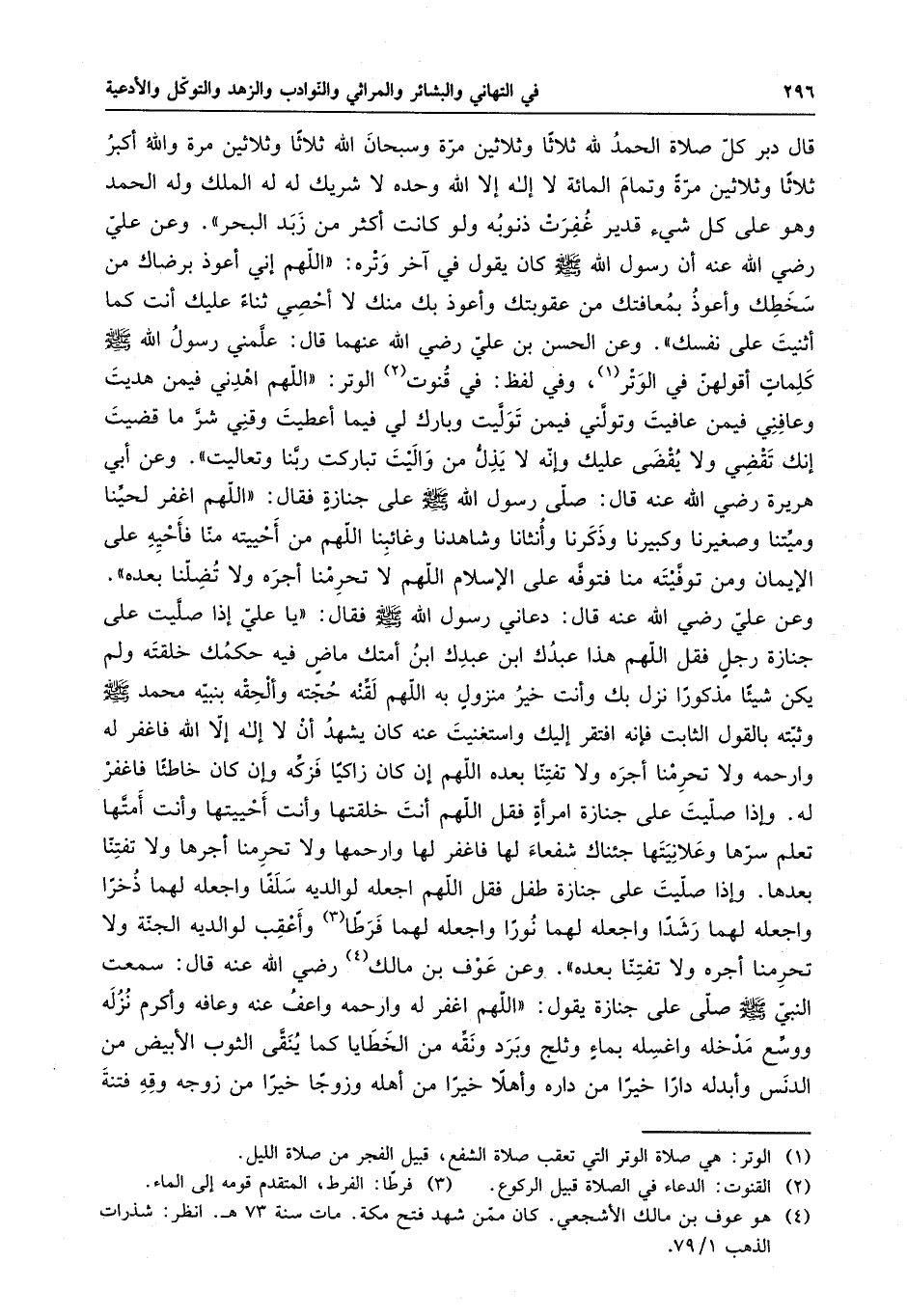 قال دبر كل صلاةٍ الحمد لله ثلاثاً وثلاثين مرةً وسبحان الله ثلاثاً وثلاثين مرةً والله أكبر ثلاثاً وثلاثين مرةً وتمام المائة لا إله إلا الله وحده لا شريك له له الملك وله الحمد وهو على كل شيءٍ قدير غفرت ذنوبه ولو كانت أكثر من زبد البحر " . وعن عليٍ رضي الله عنه أن رسول الله ( صلى الله عليه وسلم ) كان يقول في آخر وتره : " اللهم إني أعوذ برضاك من سخطك وأعوذ بمعافاتك من عقوبتك وأعوذ بك منك لا أحصي ثناءً عليك أنت كما أثنيت على نفسك " . وعن الحسن بن عليٍ رضي الله عنهما قال : علمني رسول الله ( صلى الله عليه وسلم ) كلماتٍ أقولهن في الوتر ، وفي لفظ : في قنوت الوتر : " اللهم اهدني فيمن هديت وعافني فيمنن عافيت وتولني فيمن توليت وبارك لي فيما أعطيت وقني شر ما قضيت إنك تقضي ولا يقضى عليك وإنه لا يذل من واليت تباركت ربنا وتعاليت " . وعن أبي هريرة رضي الله عنه قال : صلى رسول الله ( صلى الله عليه وسلم ) على جنازةٍ فقال : " اللهم اغفر لحينا وميتنا وصغيرنا وكبيرنا وذكرنا وأنثانا وشاهدنا وغائبنا اللهم من أحييته منا فأحيه على الإيمان ومن توفيته منا فتوفه على الإسلام اللهم لا تحرمنا أجره ولا تضلنا بعده " . وعن عليٍ رضي الله عنه قال : دعاني رسول الله ( صلى الله عليه وسلم ) فقال : " يا علي إذا صليت على جنازة رجلٍ فقل اللهم هذا عبدك ابن عبدك ابن أمتك ماضٍ فيه حكمك خلقته ولم يكن شيئاً مذكوراً نزل بك وأنت خير منزولٍ به اللهم لقنه حجته وألحقه بنبيه محمدٍ ( صلى الله عليه وسلم ) وثبته القول الثابت فإنه افتقر إليك واستغنيت عنه كان يشهد أن لا إله إلا الله فاغفر له وارحمه ولا تحرمنا أجره ولا تفتنا بعده اللهم إن كان زاكياً فزكه وإن كان خاطئاً فاغفر له . وإذا صليت على جنازة امرأةٍ فقل اللهم أنت خلقتها وأنت أحييتها وأنت أمتها تعلم سرها وعلانيتها جئناك شفعاء لها فاغفر لها وارحمها ولا تحرمنا أجرها ولا تفتنا بعدها . وإذا صليت على جنازة طفلٍ فقل اللهم اجعله لوالديه سلفاً واجعله لهما ذخراً واجعله لهما رشداً واجعله لهما نوراً واجعله لهما فرطاً وأعقب لوالديه الجنة ولا تحرمنا أجره ولا تفتنا بعده " . وعن عوف بن مالك رضي الله عنه قال : سمعت النبي ( صلى الله عليه وسلم ) وصلى على جنازةٍ يقول : " اللهم اغفر له وارحمه واعف عنه وعافه وأكرم نزله ووسع مدخله واغسله بماءٍ وثلجٍ وبردٍ ونقه من الخطايا كما ينقى الثوب الأبيض من الدنس وأبدله داراً خيراً من داره وأهلاً خيراً من أهله وزوجاً خيراً من زوجه وقه فتنة
