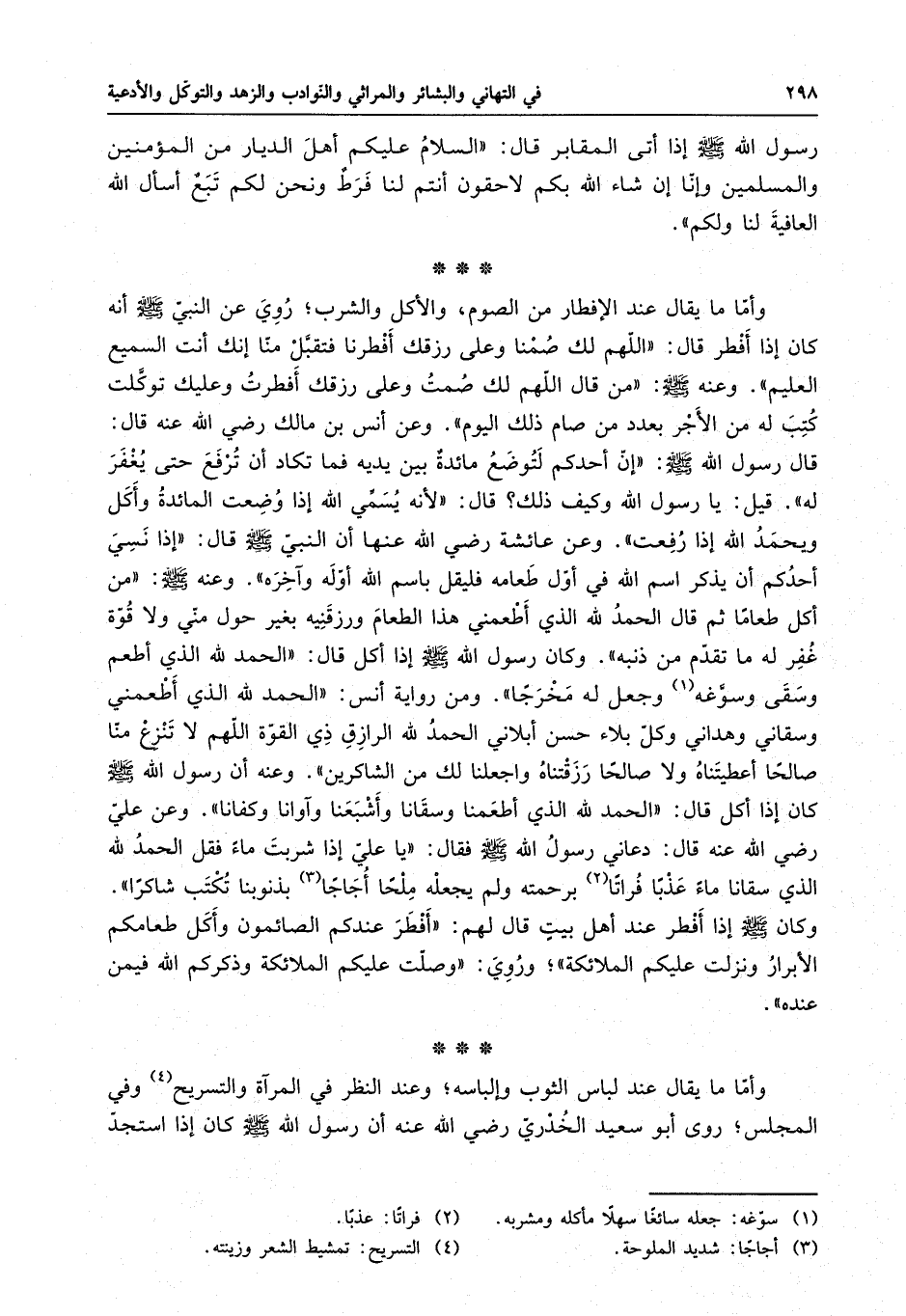 وأما ما يقال عند الإفطار من الصوم ، والأكل والشرب ، روي عن النبي ( صلى الله عليه وسلم ) أنه كان إذا أفطر قال : " اللهم لك صمنا وعلى رزقك أفطرنا فتقبل منا إنك أنت السميع العليم " . وعنه ( صلى الله عليه وسلم ) : " من قال اللهم لك صمت وعلى رزقك أفطرت وعليك توكلت كتب له من الأجر بعدد من صام ذلك اليوم " . وعن أنس بن مالكٍ رضي الله عنه قال : قال رسول الله ( صلى الله عليه وسلم ) : " إن أحدكم لتوضع مائدةٌ بين يديه فما تكاد أن ترفع حتى يغفر له " . قيل يا رسول الله وكيف ذلك ؟ قال : " لأنه يسمي الله إذا وضعت المائدة وأكل ويحمد الله وإذا رفعت " . وعن عائشة رضي الله عنها أن النبي ( صلى الله عليه وسلم ) قال : " إذا نسي أحدكم أن يذكر اسم الله في أول طعامه فليقل باسم الله أوله وآخره " . وعنه ( صلى الله عليه وسلم ) : " من أكل طعاماً ثم قال الحمد لله الذي أطعمني هذا الطعام ورزقنيه بغير حولٍ مني ولا قوةٍ غفر له ما تقدم من ذنبه " . وكان رسول الله ( صلى الله عليه وسلم ) إذا أكل قال : " الحمد لله الذي أطعم وسقى وسوغه وجعل له مخرجاً " . ومن رواية أنسٍ : " الحمد لله الذي أطعمني وسقاني وهداني وكل بلاءٍ حسنٍ أبلاني الحمد لله الرازق ذي القوة اللهم لا تنزع منا صالحاً أعطيتناه ولا صالحاً رزقتناه واجعلنا لك من الشاكرين " . وعنه أن رسول الله ( صلى الله عليه وسلم ) كان إذا أكل قال : " الحمد لله الذي أطعمنا وسقانا وأشبعنا وآوانا وكفانا " . وعن عليٍ رضي الله عنه قال : دعاني رسول الله ( صلى الله عليه وسلم ) فقال : " يا علي إذا شربت ماءً فقل الحمد لله الذي سقانا ماءً عذباً فراتاً برحمته ولم يجعله ملحاً أجاجاً بذنوبنا تكتب شاكراً " . وكان رسول الله ( صلى الله عليه وسلم ) إذا أفطر عند أهل بيتٍ قال لهم : " أفطر عندكم الصائمون وأكل طعامكم الأبرار ونزلت عليكم الملائكة " ، وروي : " وصلت عليكم الملائكة وذكركم الله فيمن عنده " . وأما ما يقال عند لباس الثوب وإلباسه ، وعند النظر في المرآة والتسريح وفي المجلس ، روى أبو سعيدٍ الخدري رضي الله عنه أن رسول الله ( صلى الله عليه وسلم ) كان إذا استجد