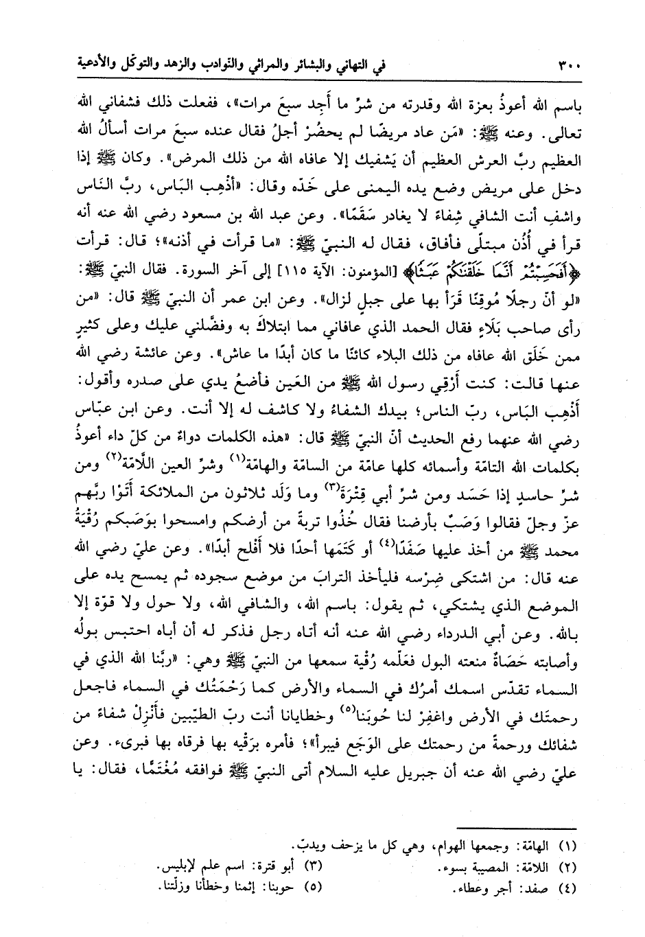 باسم الله أعوذ بعزة الله وقدرته من شر ما أجد سبع مراتٍ ، ففعلت ذلك فشفاني الله تعالى . وعنه صلى عليه وسلم : " من عاد مريضاً لم يحضر أجله فقال عنده سبع مراتٍ أسأل الله العظيم رب العرش العظيم أن يشفيك إلا عافاه الله من ذلك المرض " . وكان ( صلى الله عليه وسلم ) إذا دخل على مريضٍ وضع يده اليمنى على خده وقال : " أذهب الباس ، رب الناس واشف أنت الشافي شفاءً لا يغادر سقماً " . وعن عبد الله بن مسعود رضي الله عنه أنه قرأ في أذن مبتلًى فأفاق ، فقال له النبي ( صلى الله عليه وسلم ) : " ما قرأت في أذنه " ، قال : قرأت " أفحسبتم أنما خلقناكم عبثاً " إلى آخر السورة . فقال النبي ( صلى الله عليه وسلم ) : " لو أن رجلاً موقناً قرأ بها على جبلٍ لزال " . وعن ابن عمر أن النبي ( صلى الله عليه وسلم ) قال : " من رأى صاحب بلاءٍ فقال الحمد لله الذي عافاني مما ابتلاك وفضلني عليك وعلى كثيرٍ ممن خلق الله عافاه الله من ذلك البلاء كائناً ما كان أبداً ما عاش " . وعن عائشة رضي الله عنها قالت : كنت أرقي رسول الله ( صلى الله عليه وسلم ) من العين فأضع يدي على صدره وأقول : أذهب الباس ، رب الناس ، بيدك الشفاء ولا كاشف إلا أنت . وعن ابن عباسٍ رضي الله عنهما رفع الحديث أن النبي ( صلى الله عليه وسلم ) قال : " هذه الكلمات دواءٌ من كل داءٍ أعوذ بكلمات الله التامة وأسمائه كلها عامةً من السامة والهامة وشر العين اللامة ومن شر حاسدٍ إذا حسد ومن شر أبي قترة وما ولد له ثلاثون من الملائكة أتوا ربهم عز وجل فقالوا وصبٌ بأرضنا فقال خذوا تربةً من أرضكم وامسحوا بوصبكم رقية محمدٍ رسول الله ( صلى الله عليه وسلم ) من أخذ عليها صفداً أو كتمها أحداً فلا أفلح أبداً " . وعن عليٍ رضي الله عنه قال : من اشتكى ضرسه فليأخذ التراب من موضع سجوده ثم يمسح يده على الموضع الذي يشتكي ، ثم يقول : باسم الله ، والشافي الله ، ولا حول ولا قوة إلا بالله . وعن أبي الدرداء رضي الله عنه أنه أتاه رجلٌ فذكر له أن أباه احتبس بوله وأصابته حصاةٌ منعته البول فعلمه رقيةً سمعها من النبي ( صلى الله عليه وسلم ) وهي : " ربنا الله الذي في السماء تقدس اسمك أمرك في السماء والأرض كما رحمتك في السماء فاجعل رحمتك في الأرض واغفر لنا حوبنا وخطايانا أنت رب الطيبين فأنزل شفاءً من شفائك ورحمةً من رحمتك على الوجع فيبرأ " ، فأمره برقيةٍ فرقاه بها فبرئ . وعن عليٍ رضي الله عنه أن جبريل عليه السلام أتى النبي ( صلى الله عليه وسلم ) فوافقه مغتماً ، فقال : يا