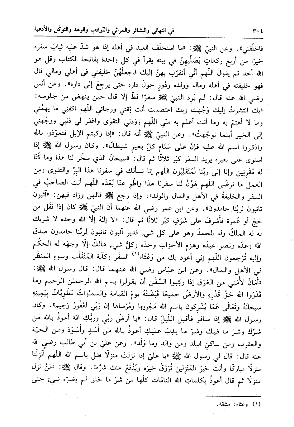 فاخلفني " . وعن النبي ( صلى الله عليه وسلم ) : " ما استخلف العبد في أهله إذا هو شد عليه ثياب سفره خيراً من أربع ركعاتٍ يصليهن في بيته يقرأ في كل واحدةٍ بفاتحة الكاتب وقل هو الله أحد ثم يقول اللهم إني أتقرب بهن إليك فاجعلهن خليفتي في أهلي ومالي قال فهو خليفته في أهله وماله وولده ودورٍ حول داره حتى يرجع إلى داره " . وعن أنسٍ رضي الله عنه قال : لم يرد النبي ( صلى الله عليه وسلم ) سفراً قط إلا قال حين ينهض من جلوسه : " بك انتشرت إليك وجهت وبك اعتصمت أنت ثقتي ورجائي اللهم اكفني ما يهمني وما لا أهتم به وما أنت أعلم به مني اللهم زودني التقوى واغفر لي ذنبي ووجهني إلى الخير أينما توجهت " . وعن النبي رسول الله ( صلى الله عليه وسلم ) أنه قال : " إذا ركبتم الإبل فتعوذوا بالله واذكروا اسم الله عليه فإن على سنام كل بعيرٍ شيطاناً " . وكان رسول الله ( صلى الله عليه وسلم ) إذا استوى على بعيره يريد السفر كبر ثلاثاً ثم قال : سبحان الذي سخر لنا هذا وما كنا له مقرنين وإنا إلى ربنا لمنقلبون اللهم إنا نسألك في سفرنا هذا البر والتقوى ومن العمل ما ترضى اللهم هون لنا سفرنا هذا واطو عنا بعده اللهم أنت الصاحب في السفر والخليفة في الأهل والمال والولد " ، وإذا رجع رسول الله ( صلى الله عليه وسلم ) قالهن وزاد فيهن : " آئبون تائبون لربنا حامدون " . وعن ابن عمر رضي الله عنهما أن النبي ( صلى الله عليه وسلم ) كان إذا قفل من حجٍ أو عمرةٍ فأشرف على شرفٍ كبر ثلاثاً ثم قال : " لا إله إلا الله وحده لا شريك له له الملك وله الحمد وهو على كل شيءٍ قدير آئبون تائبون لربنا حامدون صدق الله وعده ونصر عبده وهزم الأحزاب وحده وكل شيءٍ هالكٌ إلا وجهه له الحكم وإليه ترجعون اللهم إني أعوذ بك من وعثاء السفر وكآبة المنقلب وسوء المنظر في الأهل والمال " . وعن ابن عباس رضي الله عنهما قال : قال رسول الله ( صلى الله عليه وسلم ) : " أمانٌ لأمتي من الغرق إذا ركبوا السفن أن يقولوا باسم الله الرحمن الرحيم وما قدروا الله حق قدره والأرض جميعاً قبضته يوم القيامة والسماوات مطوياتٌ بيمينه سبحانه وتعالى عما يشركون باسم الله مجريها ومرساها إن ربي لغفورٌ رحيم " . وكان رسول الله ( صلى الله عليه وسلم ) إذا سافر فأقبل الليل قال : " يا أرض ربي وربك الله أعوذ بالله من شرك وشر ما فيك وشر ما يدب عليك أعوذ بالله من أسدٍ وأسود ومن الحية والعقرب ومن ساكن البلد ومن والدٍ وما ولد " . وعن عليٍ بن أبي طالبٍ رضي الله عنه قال : قال لي رسول الله ( صلى الله عليه وسلم ) : " يا علي إذا نزلت منزلاً فقل باسم الله اللهم أنزلنا منزلاً مباركاً وأنت خير المنزلين ترزق خيره ويدفع عنك شره " . وقال ( صلى الله عليه وسلم ) : " من نزل منزلاً وقال أعوذ بكلمات الله التامات كلها من شر ما خلق لم يضره شيءٌ حتى