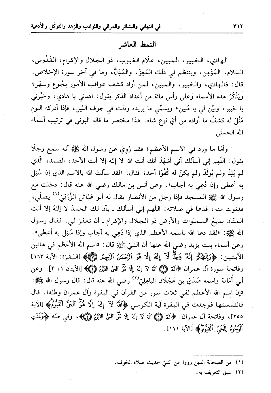 الهادي ، الخبير ، المبين ، علام الغيوب ، ذو الجلال والإكرام ، القدوس ، السلام ، المؤمن ، وينتظم في ذلك المعز ، والمذل ، وما في آخر سورة الإخلاص . قال : فالهادي ، والخبير ، والمبين ، لمن أراد كشف عواقب الأمور بجوعٍ وسهر ، ويذكر هذه الأسماء وعلى رأس مائةٍ من أعداد الذكر يقول : اهدني يا هادي ، وخبرني يا خبير ، وبين لي يا مبين ، ويسمي ما يريده وذلك في جوف الليل ، فإذا أدركه النوم مثل له كشف ما أراد من أي نوعٍ شاء . هذا مختصر ما قاله البوني في ترتيب أسماء الله الحسنى . وأما ما ورد في الاسم الأعظم ، فقد روي عن رسول الله ( صلى الله عليه وسلم ) أنه سمع رجلاً يقول : اللهم إني أسألك أني أشهد أنك أنت الله لا إله إلا أنت الأحد ، الصمد ، الذي لم يلد ولم يولد ولم يكن له كفواً أحد ، فقال : " لقد سألت الله بالاسم الذي إذا سأل به أعطى وإذا دعي به أجاب " . وعن أنس بن مالكٍ رضي الله عنه قال : دخلت مع رسول الله ( صلى الله عليه وسلم ) المسجد فإذا رجلٌ من الأنصار يقال له أبو عياشٍ الزرقي يصلي ، فدنوت منه ، فدعا في صلاته : اللهم إني أسألك - بأن لك الحمد لا إله إلا أنت المنان بديع السماوات والأرض ذو الجلال والإكرام - أن تغفر لي . فقال رسول الله ( صلى الله عليه وسلم ) : " لقد دعا الله باسمه الأعظم الذي إذا دعي به أجاب وإذا سئل به أعطى " . وعن أسماء بنت يزيدٍ رضي الله عنها أن النبي ( صلى الله عليه وسلم ) قال : " اسم الله الأعظم في هاتين الآيتين وإلهكم إلهٌ واحدٌ لا إله إلا هو الرحمن الرحيم " وفاتحة سورة آل عمران " الم الله لا إله إلا هو الحي القيوم " . وعن أبي أمامة واسمه صدي بن عجلان الباهلي رضي الله عنه قال : قال رسول الله ( صلى الله عليه وسلم ) : " إن اسم الله الأعظم لفي ثلاث سورٍ من القرآن في البقرة وآل عمران وطه " . قال فالتمستهما فوجدت في البقرة آية الكرسي " الله لا إله إلا هو الحي القيوم " ، وفاتحة آل عمران " الم الله لا إله إلا هو الحي القيوم " ، وفي طه " عنت الوجوه للحي القيوم " .