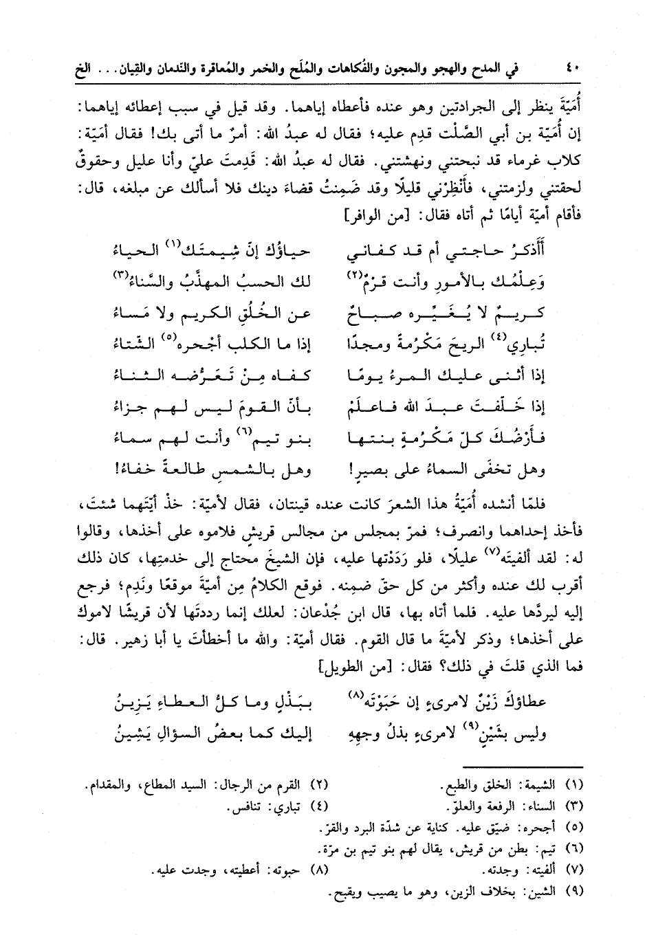 وهل تخفى السماء على بصيرٍ . . . وهل بالشمس طالعةً خفاء فلما أنشده أمية هذا الشعر كانت عنده قينتان ، فقال لأمية : خذ أيتهما شئت ، فأخذ إحداهما وانصرف ، فمر بمجلسٍ من مجالس قريشٍ فلاموه على أخذها ، وقالوا له : لقد ألفيته عليلاً ، فلو رددتها عليه ، فإن الشيخ محتاجٌ إلى خدمتها ، كان ذلك أقرب لك عنده وأكثر من كل حقٍ ضمنه . فوقع الكلام من أمية موقعاً وندم ، فرجع إليه ليردها عليه . فلما أتاه بها ، قال ابن جدعان : لعلك إنما رددتها لأن قريشاً لاموك على أخذها ، وذكر لأمية ما قال القوم . فقال أمية : والله ما أخطأت يا أبا زهير . قال : فما الذي قلت في ذلك ؟ فقال :
