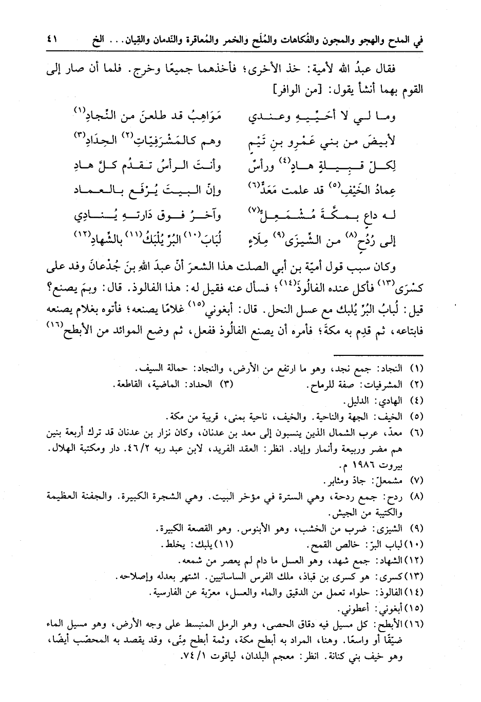 وكان سبب قول أمية بن أبي الصلت هذا الشعر أن عبد الله بن جدعان وفد على كسرى فأكل عنده الفالوذ ، فسأل عنه فقيل له : هذا الفالوذ . قال : وبم يصنع ؟ قيل : لباب البر يلبك مع عسل النحل . قال : أبغوني غلاماً يصنعه ، فأتوه بغلامٍ يصنعه فابتاعه ، ثم قدم به مكة ، فأمره أن يصنع الفالوذ ففعل ، ثم وضع الموائد من الأبطح