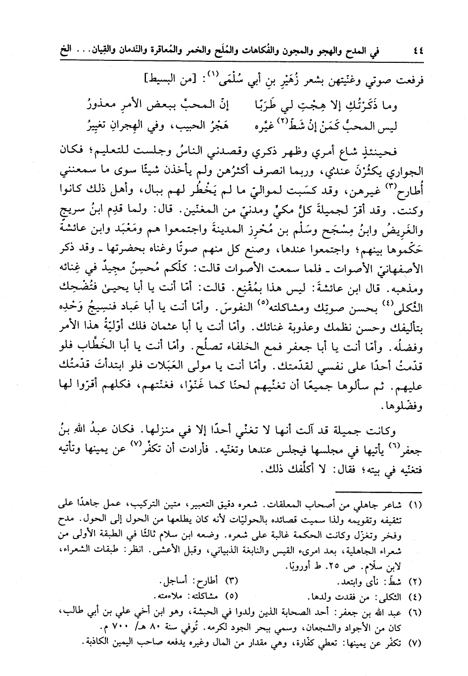 وكانت جميلة قد آلت أنها لا تغني أحداً إلا في منزلها . فكان عبد الله بن جعفر يأتيها في مجلسها فيجلس عندها وتغنيه . فأرادت أن تكفر عن يمينها وتأتيه فتغنيه في بيته ، فقال : لا أكلفك ذلك .