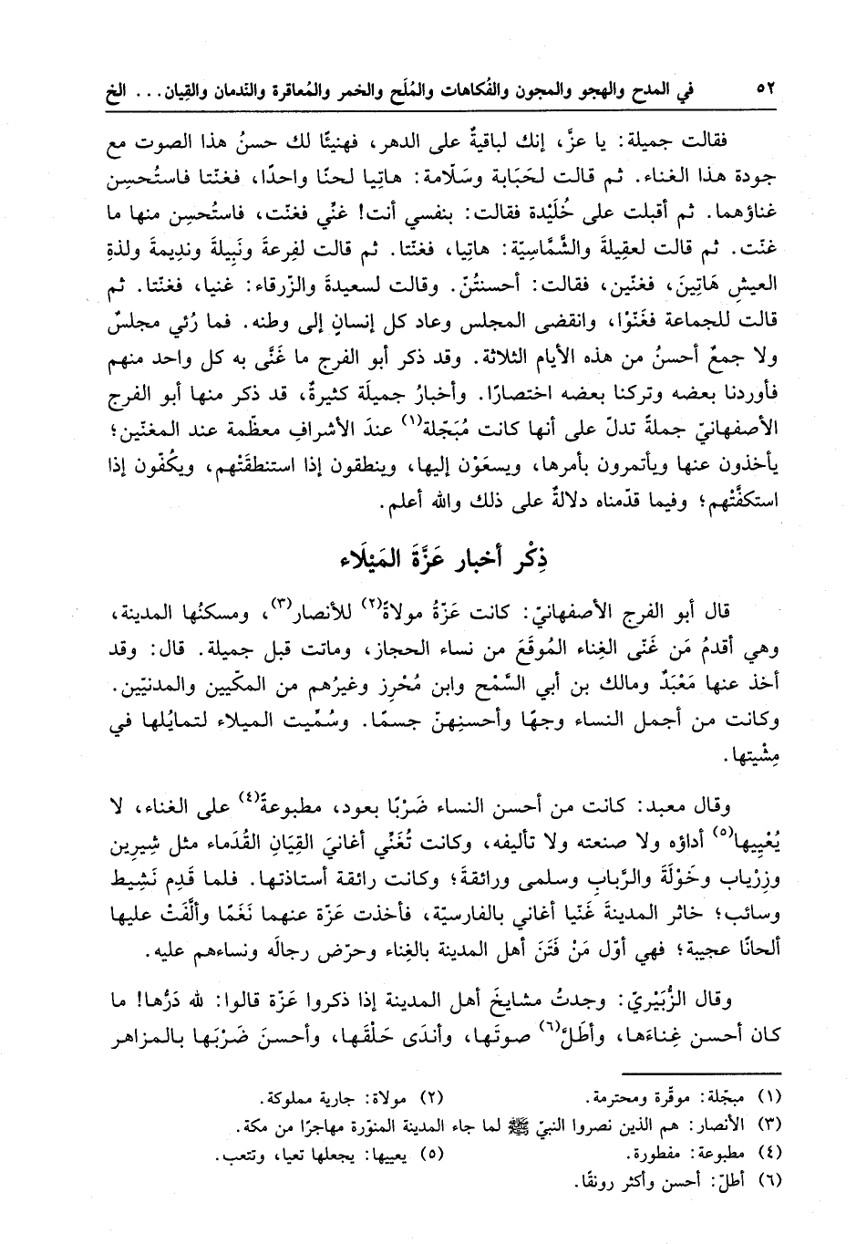 فقالت جميلة : يا عز ، إنك لباقيةٌ على الدهر ، فهنيئاً لك حسن هذا الصوت مع جودة هذا الغناء . ثم قالت لحبابة وسلامة : هاتيا لحناً واحداً ، فغنتا فاستحسن غناؤهما . ثم أقبلت على خليدة فقالت : بنفسي أنت غني فغنت ، فاستحسن منها ما غنت . ثم قالت لعقيلة والشماسية : هاتيا ، فغنتا . ثم قالت لفرعة ونبيلة ونديمة ولذة العيش هاتين ، فغنين ، فقالت : أحسنتن . وقالت لسعيدة والزرقاء : غنيا ، فغنتا . ثم قالت للجماعة فغنوا ، وانقضى المجلس وعاد كل إنسانٍ إلى وطنه . فما رئي مجلسٌ ولا جمعٌ أحسن من هذه الأيام الثلاثة . وقد ذكر أبو الفرج ما غنى به كل واحدٍ منهم فأوردنا بعضه وتركنا بعضه اختصارا . وأخبارٌ جميلة كثيرة ، قد ذكر منها أبو الفرج الأصفهاني جملةً تدل على أنها كانت مبجلةً عند الأشراف معظمةً عند المغنين ، يأخذون عنها ويأتمرون بأمرها ، ويسعون إليها ، وينطقون إذا استنطقتهم ، ويكفون إذا استكفتهم ، وفيما قدمناه دلالةً على ذلك والله أعلم .