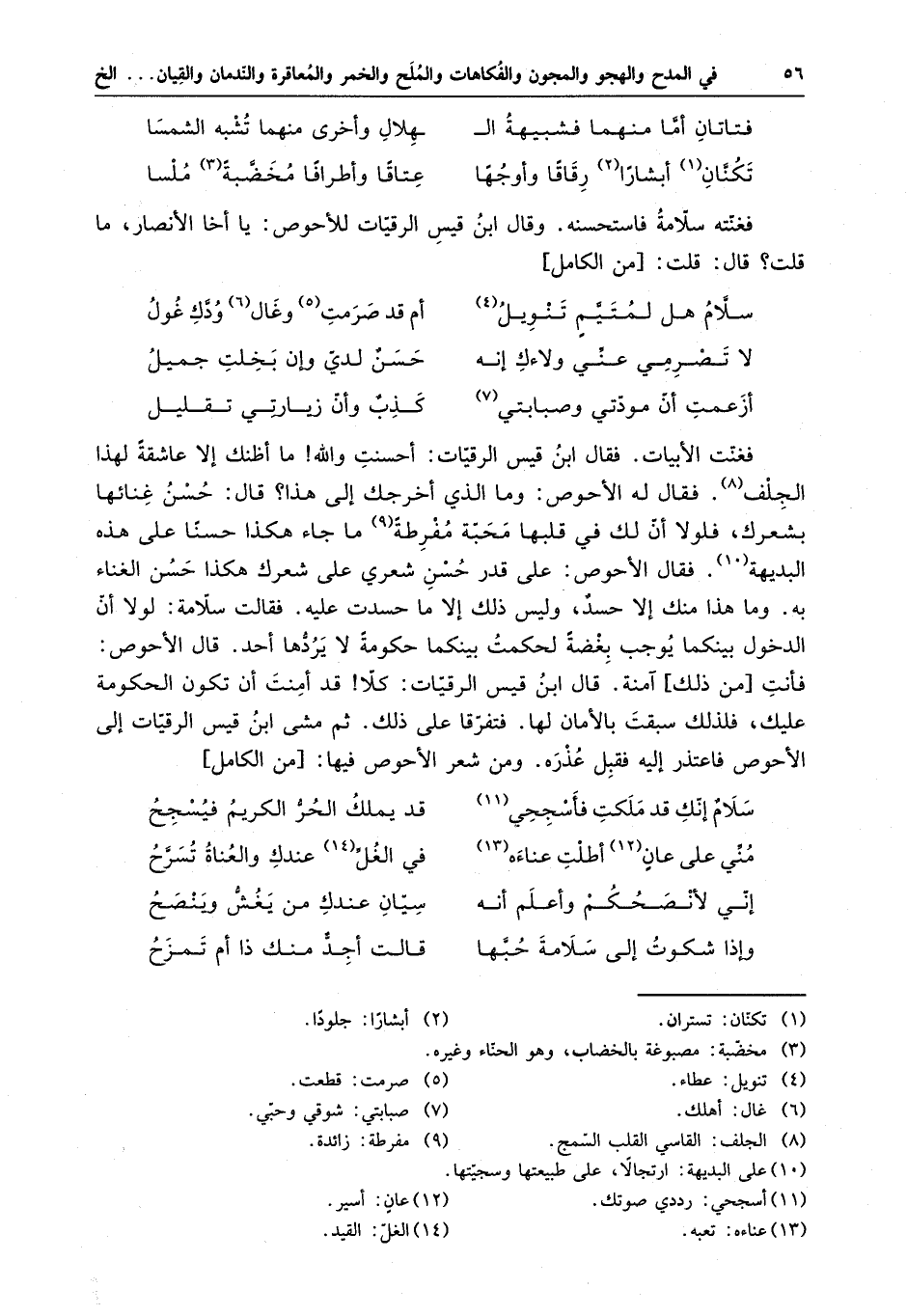 أزعمت أن مودتي وصبابتي . . . كذبٌ وان زيارتي تقليل فغنت الأبيات . فقال ابن قيس الرقيات : أحسنت والله ما أظنك إلا عاشقةً لهذا الجلف . فقال له الأحوص : وما الذي أخرجك إلى هذا ؟ قال : حسن غنائها بشعرك ، فلولا أن لك في قلبها محبةً مفرطةً ما جاء هكذا حسناً على هذه البديهة فقال الأحوص : على قدر حسن شعري على شعرك هكذا حسن الغناء به . وما هذا منك إلا حسدٌ ، وليس ذلك إلا ما حسدت عليه . فقالت سلامة : لولا أن الدخول بينكما يوجب بغضةً لحكمت بينكما حكومةً لا يردها أحد . قال الأحوص : فأنت من ذلك آمنة . قال قس بن الرقيات : كلا قد أمنت أن تكون الحكومة عليك ، فلذلك سبقت بالأمان لها . فتفرقا على ذلك . ثم مشى ابن قيس الرقيات إلى الأحوص فاعتذر إليه فقبل عذره . ومن شعر الأحوص فيها :