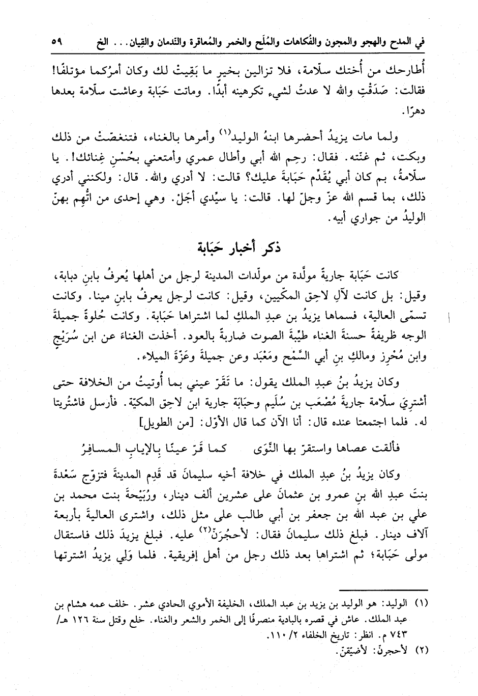 وكان يزيد بن عبد الملك يقول : ما تقر عيني ما أوتيت من الخلافة حتى أشتري سلامة جارية مصعب بن سليم وحبابة جارية ابن لاحق المكية . فأرسل فاشتريتا له . فلما اجتمعنا عنده قال : أنا الآن كما قال الأول :